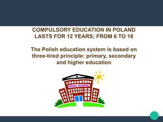 The educational system in Poland follows a three-tiered structure of primary, secondary, and higher education. Primary education lasts for 8 years from ages 7-15 and is compulsory. Students then choose either a basic vocational, technical secondary, general lyceum, or specialized lyceum school, each lasting 3-5 years. Higher education consists of bachelor's, master's and doctoral programs and includes universities and polytechnics. The Polish educational system is undergoing reforms to shorten compulsory education and track students earlier to vocational or general secondary programs.