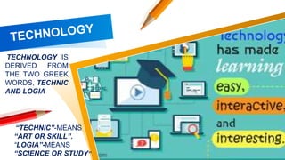 Educational technology refers to the application of scientific knowledge and methods to improve the process of education. It has evolved over time from the use of early teaching aids to incorporate hardware like computers, software programs, and systems approaches. Modern educational technology also utilizes digital technologies, online learning platforms, virtual and augmented reality, and adaptive learning methods. It is a multidisciplinary field that draws from cognitive science, computer science, psychology and other areas to enhance teaching and learning experiences.