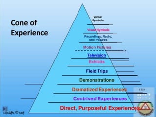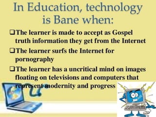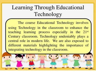 Educational technology can facilitate learning and improve performance. It refers to creating, using, and managing technological processes and resources to aid teaching. While technology can benefit learning, it also poses risks. There are different approaches to incorporating technology into teaching - it can serve as the teacher presenting content, or as a medium for learners to construct their own understandings. Bloom's taxonomy provides a framework for categorizing educational objectives and can guide the use of technology to achieve different learning outcomes.