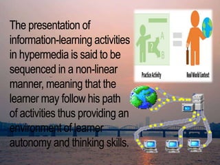 The document discusses understanding hypermedia, which includes tutorial software packages, knowledge webpages, simulation instructional games, and learning project management. It notes that hypermedia involves a variety of media and that computers depend on human input, following the principle of "garbage in, garbage out." The document also mentions steps for effective instruction, including getting learners' attention, informing them of objectives, guiding learning and eliciting performance, and assessing performance. It concludes with the word "Komawo".