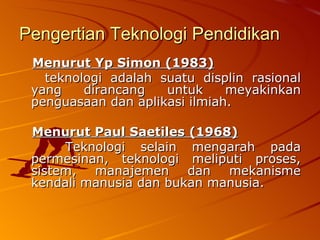 Dokumen ini membahas mengenai teknologi pendidikan dan teknologi instruksional, merujuk pada berbagai definisi dan konsep dari para ahli. Teknologi pendidikan diidentifikasi sebagai disiplin yang bertujuan memecahkan masalah belajar dan meningkatkan kinerja melalui pendekatan sistemik. Selain itu, teknologi instruksional dianggap sebagai bagian dari teknologi pendidikan yang mencakup desain, pengembangan, dan evaluasi proses belajar.