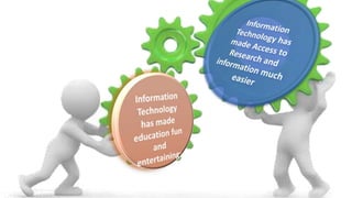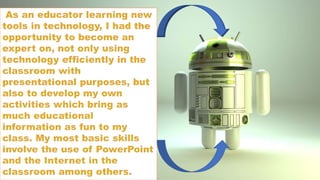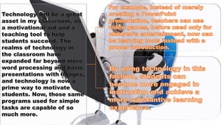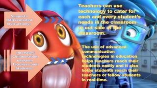 The document discusses the integration of educational technology in teaching, emphasizing that it should enhance learning without replacing traditional teachers. It outlines various teaching strategies, the importance of technology in improving student engagement and skills, and the necessity of appropriate technology use in classrooms. Moreover, it highlights the benefits of technology for both teachers and students, including access to resources and improved educational outcomes.