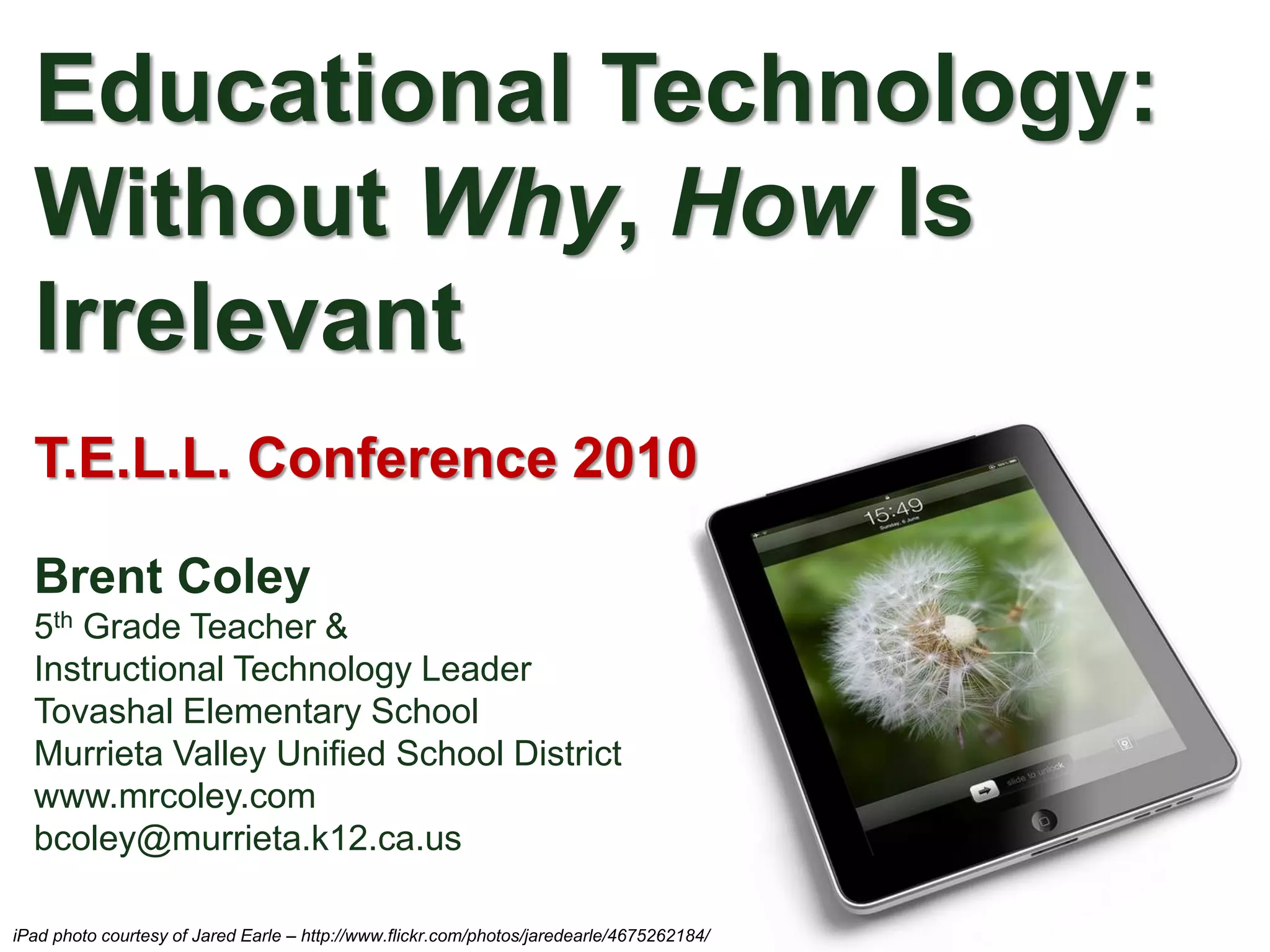 This document summarizes a presentation by Brent Coley about using educational technology effectively in the classroom. Coley argues that technology should not be more important than the teacher, and that it is irrelevant to discuss how to use technology ("how") without establishing a clear purpose or reason for its use ("why"). He then provides examples of how he uses various technologies like websites, podcasts, videos and social media to connect with students, help them prepare for class, and allow them to share what they've learned.