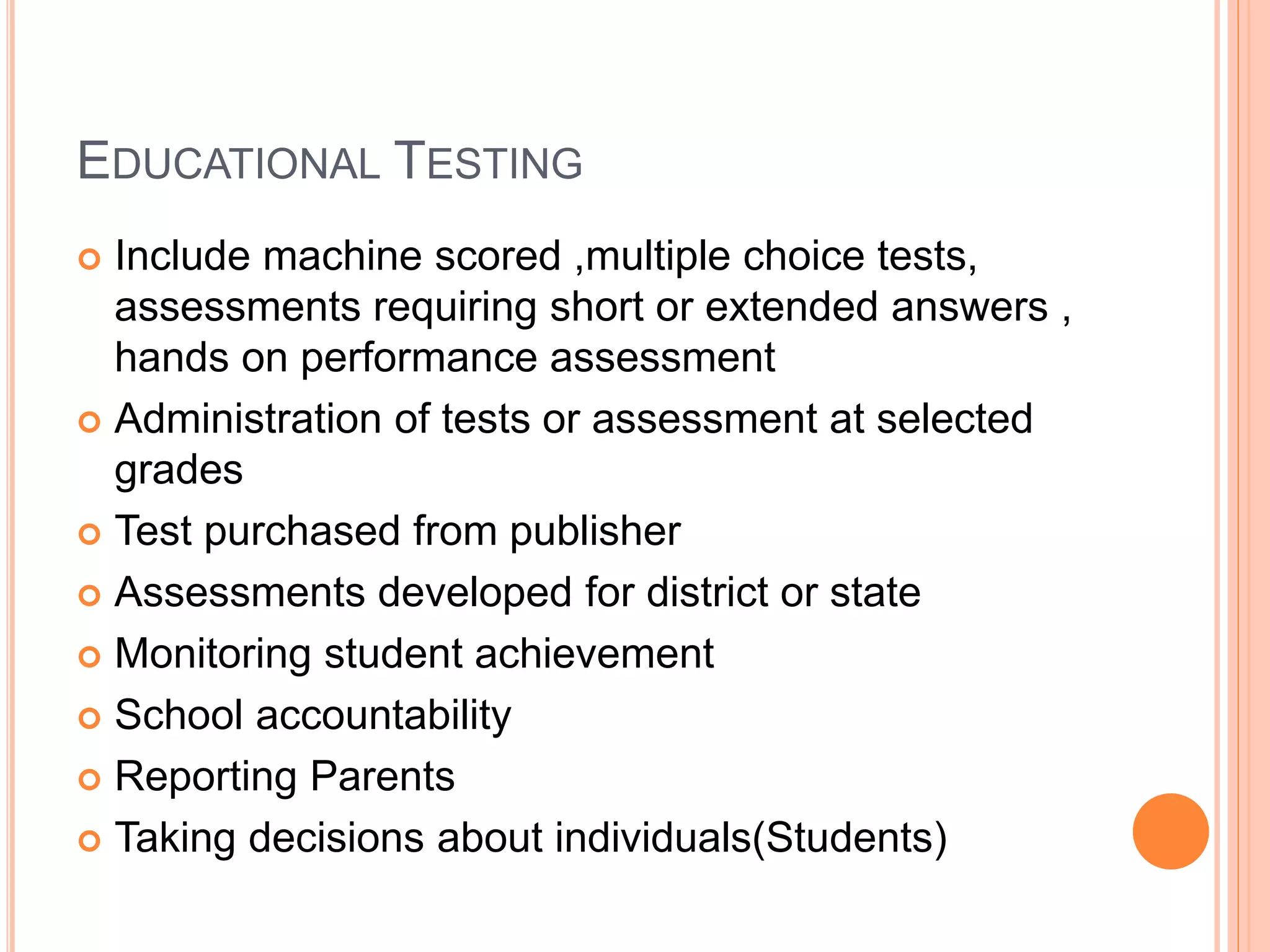 This document discusses educational testing and assessment, including definitions of tests and assessments, factors that make them appealing to policymakers, the history of test-based educational reform over the past four decades, national and international assessments, technological advances, public concerns, effects on students, and issues of fairness. It covers a wide range of topics related to educational testing at a high level.
