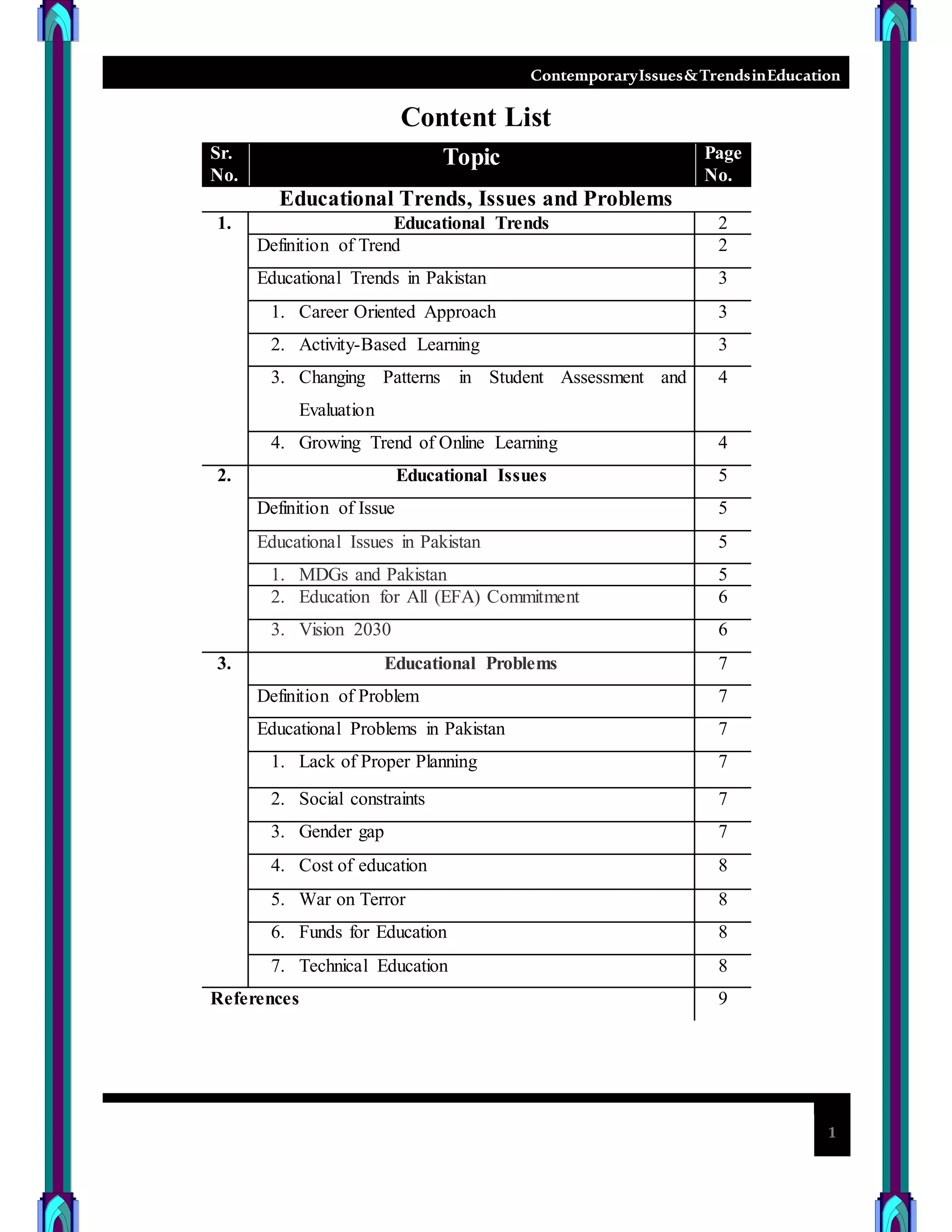 Educational trends in Pakistan include a career-oriented approach, activity-based learning, and changing patterns in student assessment. Online learning is also growing. Major educational issues are lagging behind MDGs and EFA commitments due to problems like gender gaps, lack of planning, and low funding. Key educational problems include social constraints, the cost of education, lack of technical education, and poverty. Addressing these issues and problems is important for improving education in Pakistan.