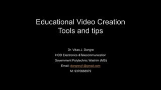 The document provides tools and tips for creating educational videos. It discusses using software like Filmora and PowerPoint for screen recording and video editing. Tips include using proper fonts, spacing, and animation to engage students. Videos should have structure and strategy with a title, objectives, and questions. Hardware like a smartphone, tripod, and microphone are recommended. The document emphasizes learning video skills as it is important for 21st century teaching and improving one's online presence. Videos uploaded to YouTube can reach a global audience when given proper titles, descriptions, and tags.