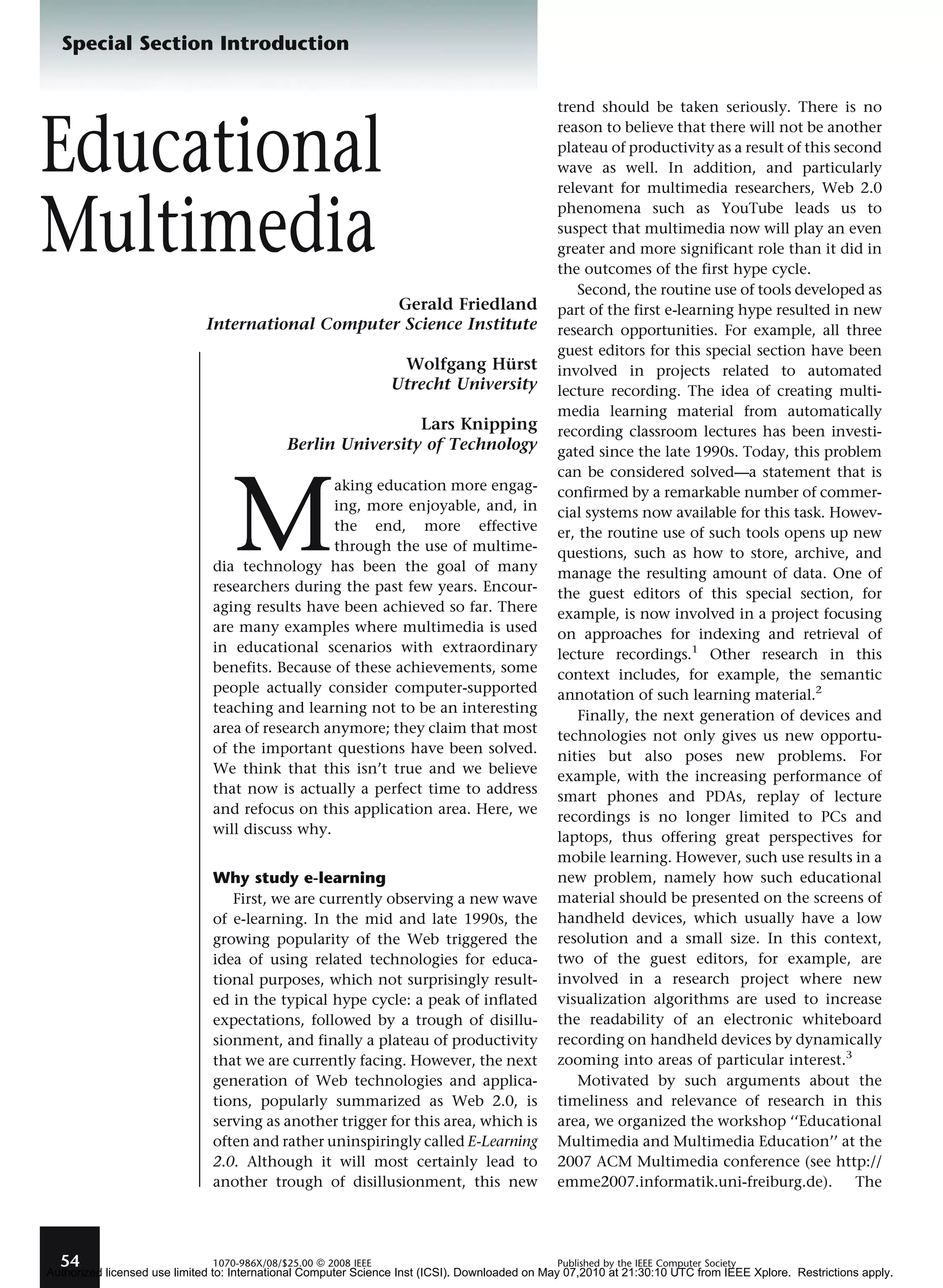 This document introduces a special section on educational multimedia. It discusses that while multimedia in education has achieved success, there are still open questions to explore, as new technologies and their use cases emerge. Three selected articles are summarized that represent current trends - automating lecture recording, adding handwriting to intelligent tutors, and application-specific music transcription. The selection covers different topics from different world regions and involves multidisciplinary collaboration, illustrating the potential and challenges in the field.
