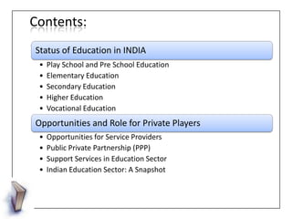 The document provides an overview of the status and opportunities in the education sector in India. It summarizes the current state of various levels of education including pre-school, elementary, secondary, higher education and vocational training. It highlights issues like low enrollment rates, lack of quality and infrastructure challenges. The document also outlines opportunities for private players in areas like teacher training institutes, operating schools and universities, distance education, vocational training programs and ICT/e-learning solutions. It provides examples of successful private education companies in India.