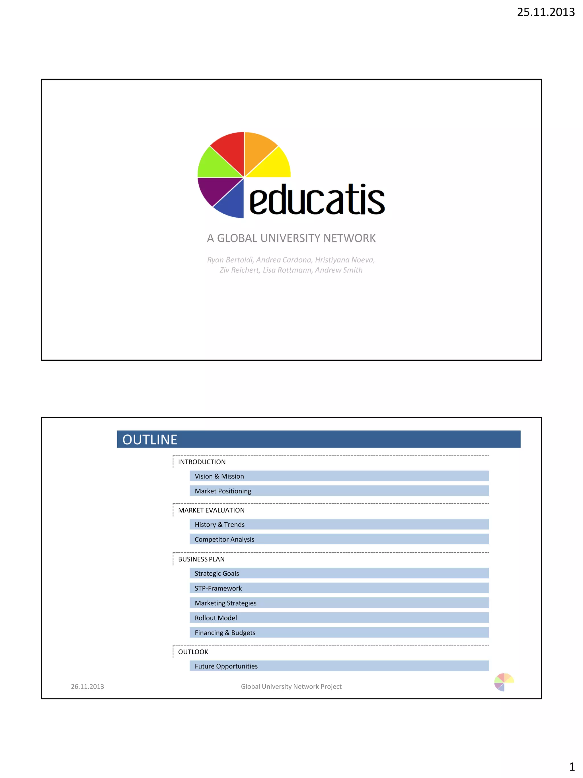 The document outlines plans for EDUCATIS, a global university network that aims to provide online education solutions on a global scale. Their mission is to build a globally connected network of accredited universities to provide affordable, discounted education. The business plan involves partnering with 10 top European universities to offer 12,000 students accredited degree programs through an online platform within 5 years, becoming a top 10 online education provider. They will target both individual students seeking convenient, discounted education (B2C) and universities seeking to offer online programs (B2B).