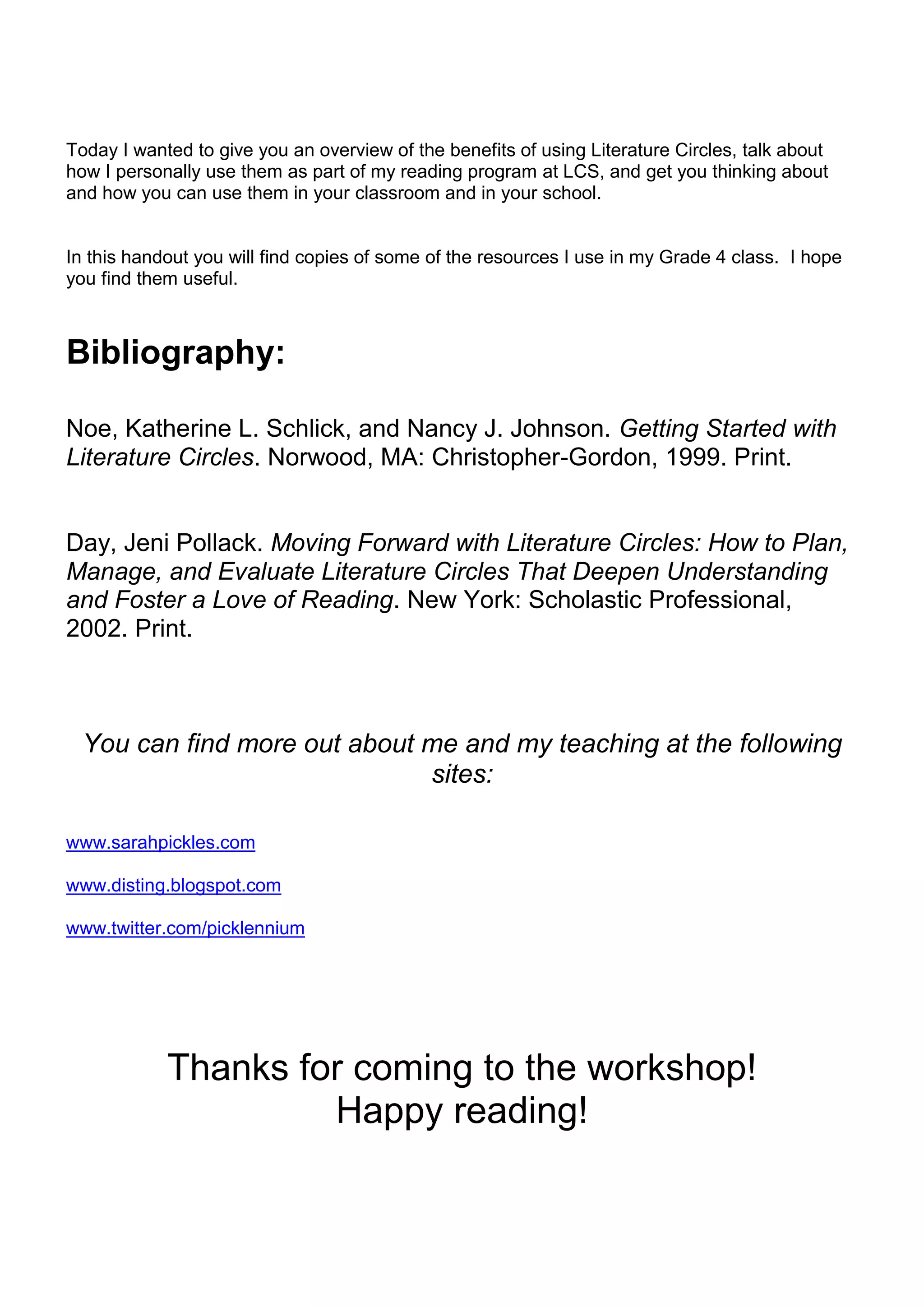 This document provides an overview of literature circles and how Sarah Pickles uses them in her 4th grade classroom. It includes 8 appendices that provide resources for implementing literature circles such as a letter to parents, descriptions of discussion roles, rubrics for assessment, and reflection questions. The goal of literature circles is to allow students to discuss texts in small groups at their independent reading level. Students take turns filling different discussion roles to prepare for and guide conversations. Literature circles are intended to help students engage more deeply with texts and improve reading comprehension and enjoyment.