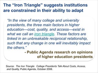 The document discusses how digital technologies and Open Educational Resources (OER) are transforming higher education by challenging the constraints of the 'iron triangle' of costs, quality, and access. It emphasizes the importance of sharing educational resources to reduce financial burdens on students and stimulate educational attainment. The document advocates for adopting open licensing practices to encourage collaboration and efficient use of public educational materials.
