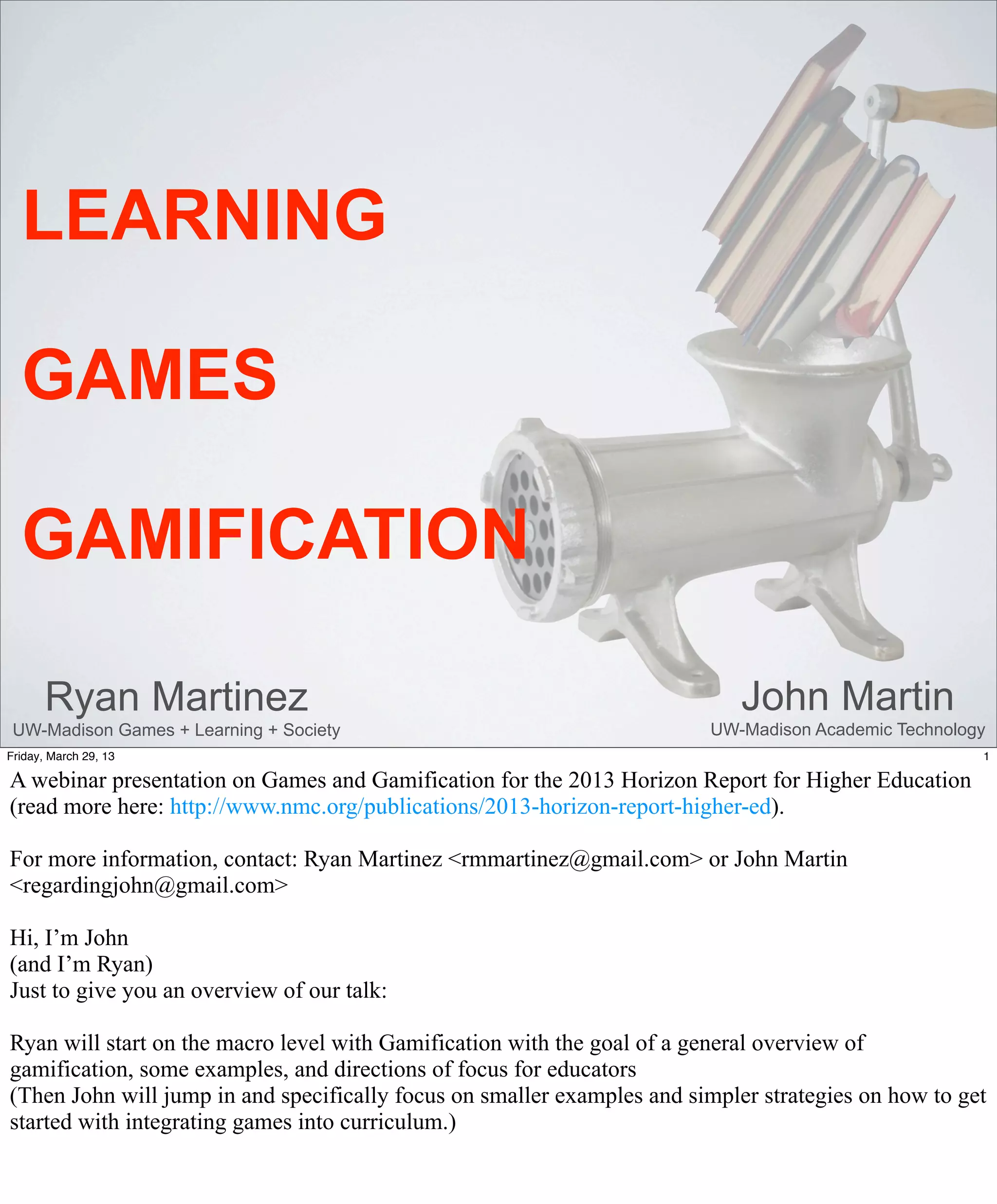 The document outlines a webinar presentation on gamification and its impact on education, focusing on its definition, methodologies, and examples of both successful and poor implementations. Key contributors like Ryan Martinez and John Martin discuss the motivational aspects of gamification, including intrinsic and extrinsic motivation, and highlight differing perspectives from researchers like Jane McGonigal and Ian Bogost. The presentation emphasizes the importance of thoughtful design in gamified environments to avoid negative consequences and maximize engagement in educational contexts.