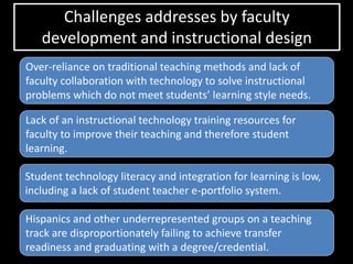 The document outlines goals and challenges for the Educational Studies program, and a plan to address them through faculty development and instructional design over 3 years. The goals are to improve technology literacy of future educators, and graduation rates of underrepresented groups. Challenges include low student technology skills, lack of e-portfolios, and reliance on traditional teaching. The plan provides ongoing training and resources to help faculty integrate learning technologies like screencasting, e-portfolios, and digital textbooks into their courses to improve student learning. Progress will be evaluated each year through course assessments and content redesign.