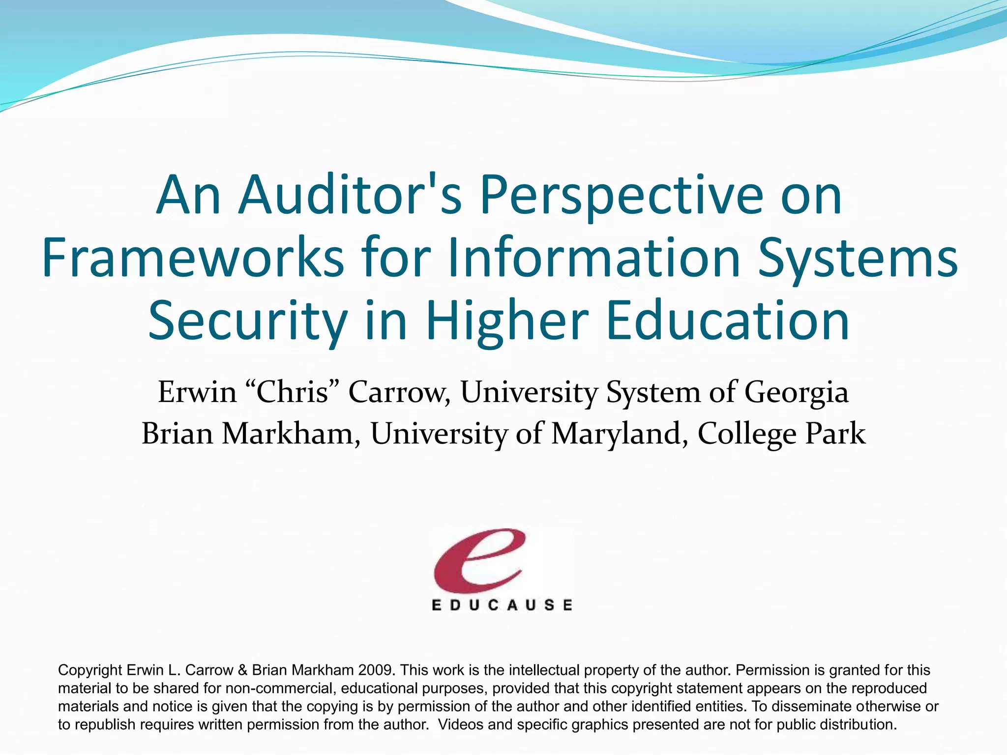 The document discusses an auditor's perspective on frameworks for information systems security in higher education. It provides an agenda for a session that will help attendees identify business goals and functions, understand critical success factors during an audit, evaluate internal control structures, and learn about available security standards and frameworks. The session guides will discuss challenges in auditing higher education from both a high and low level perspective. [END SUMMARY]