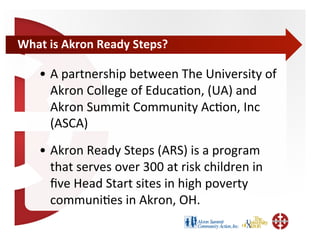 This document discusses the Akron Ready Steps program, which serves over 300 at-risk children in five Head Start sites in Akron, Ohio. It aims to provide preschoolers with key knowledge and skills, train teachers, design literacy-rich learning environments, engage parents, and strengthen early education in the community. The document poses questions about e-books, including what makes a high-quality e-book for young children, whether they can support literacy skills, and what digital elements and design features are best. It proposes designing research on e-books that involves observing student engagement with e-books and teacher instruction with the technology.
