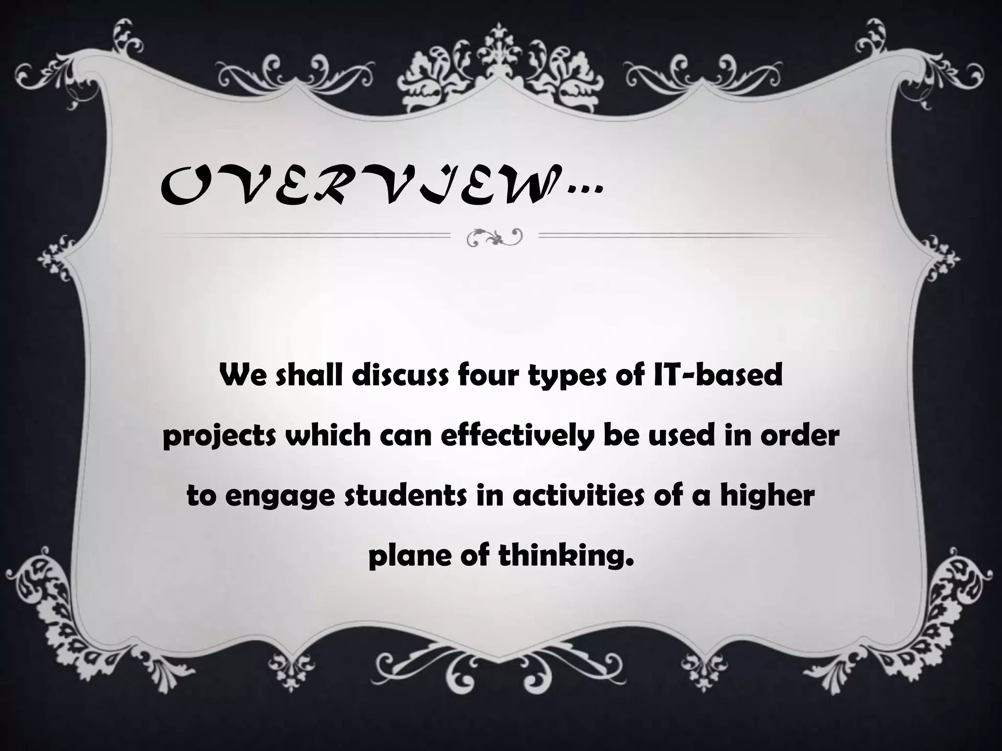This document discusses four IT-based projects to engage students in higher-level thinking: 1) Resource-based projects require students to research a topic and organize information to answer questions, going beyond textbooks; 2) Simple creations focus on planning, making, and designing using software; 3) Guided hypermedia projects use hypermedia as an instructional or communication tool; 4) Web-based projects involve students creating and posting web pages on a given topic. The key elements are creating a learning environment where students demonstrate skills like searching, organizing, and synthesizing information.