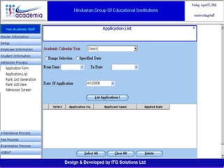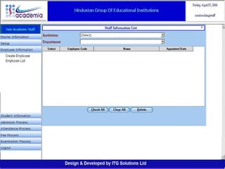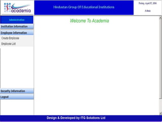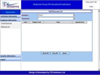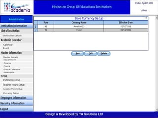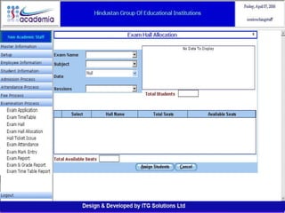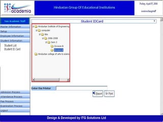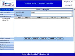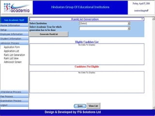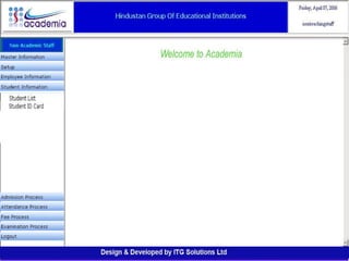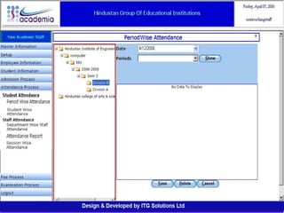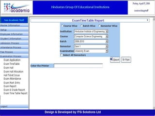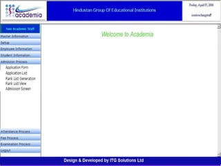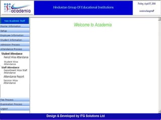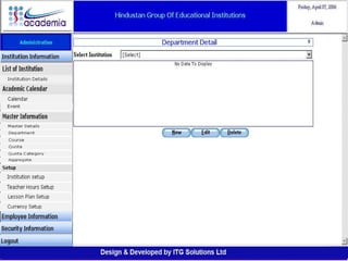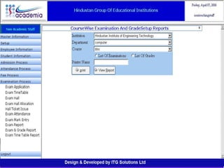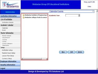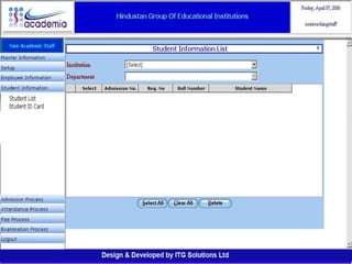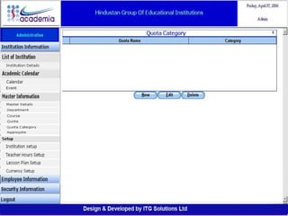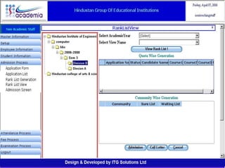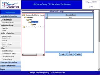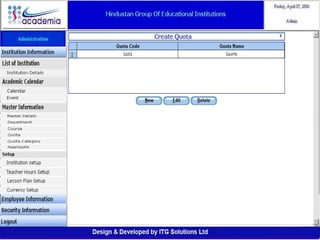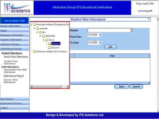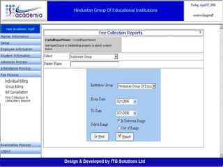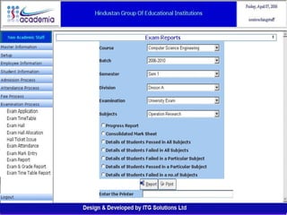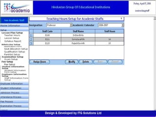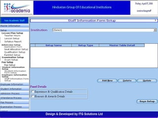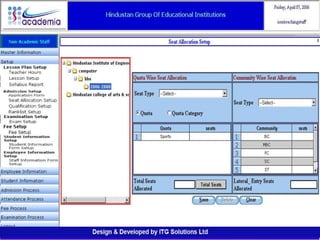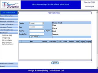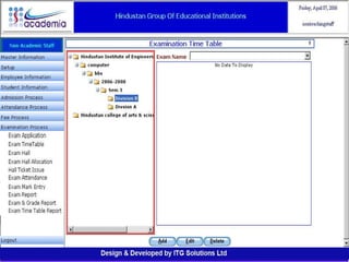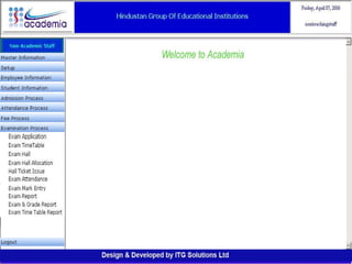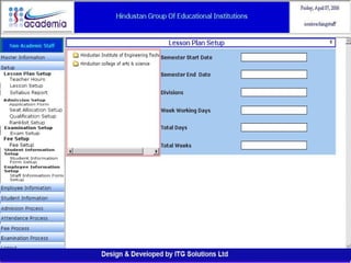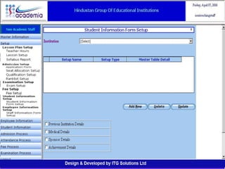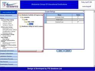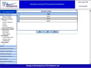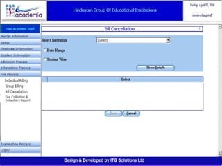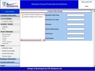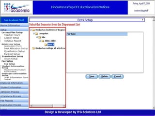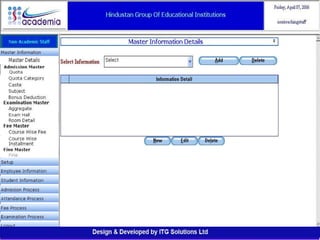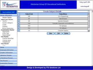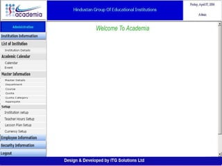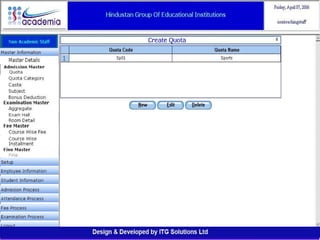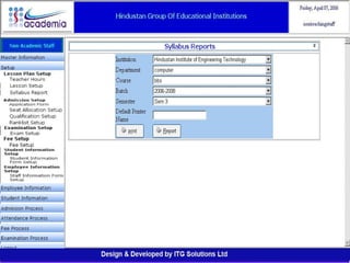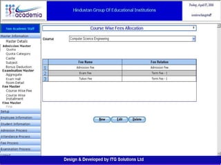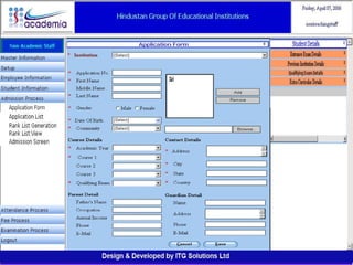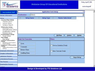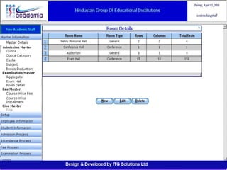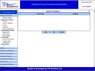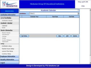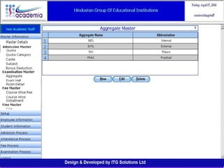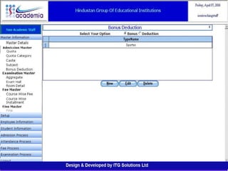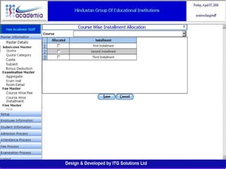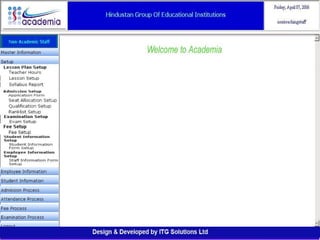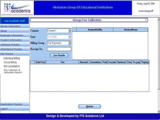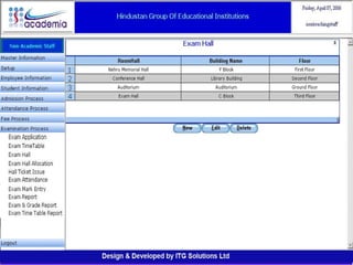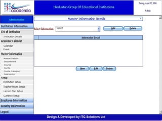 The document outlines a comprehensive ERP solution for educational institutions delivered via a Software as a Service (SaaS) model, eliminating upfront costs and hardware requirements. It features various modules for management, administration, parents, teachers, and students, facilitating functions such as admission, fee management, attendance, and academic performance tracking. Key advantages include a pay-as-you-go model, centralized management, enhanced scalability, and robust data security.