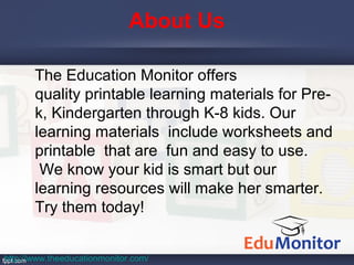 The Education Monitor offers printable learning materials for Pre-K through 8th grade, including worksheets, coloring pages, and activities related to topics like dinosaurs, Thanksgiving, Kwanzaa, and summer learning. It provides these resources on its website along with articles on schools, the importance of parent involvement, and maintaining relationships with teachers. Contact information is given for the company located in Oklahoma City.