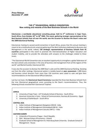 Eduniversal held its 2nd World Convention in Cape Town, South Africa from October 26th to 28th, 2009. Over 120 representatives from business schools in 45 countries attended to discuss internationalization and student mobility. Eduniversal disclosed the results of their 2009 rankings, which are based on peer assessments from over 1,000 deans. The convention also awarded trophies to the top 3 business schools in each of Eduniversal's 9 geographical zones.