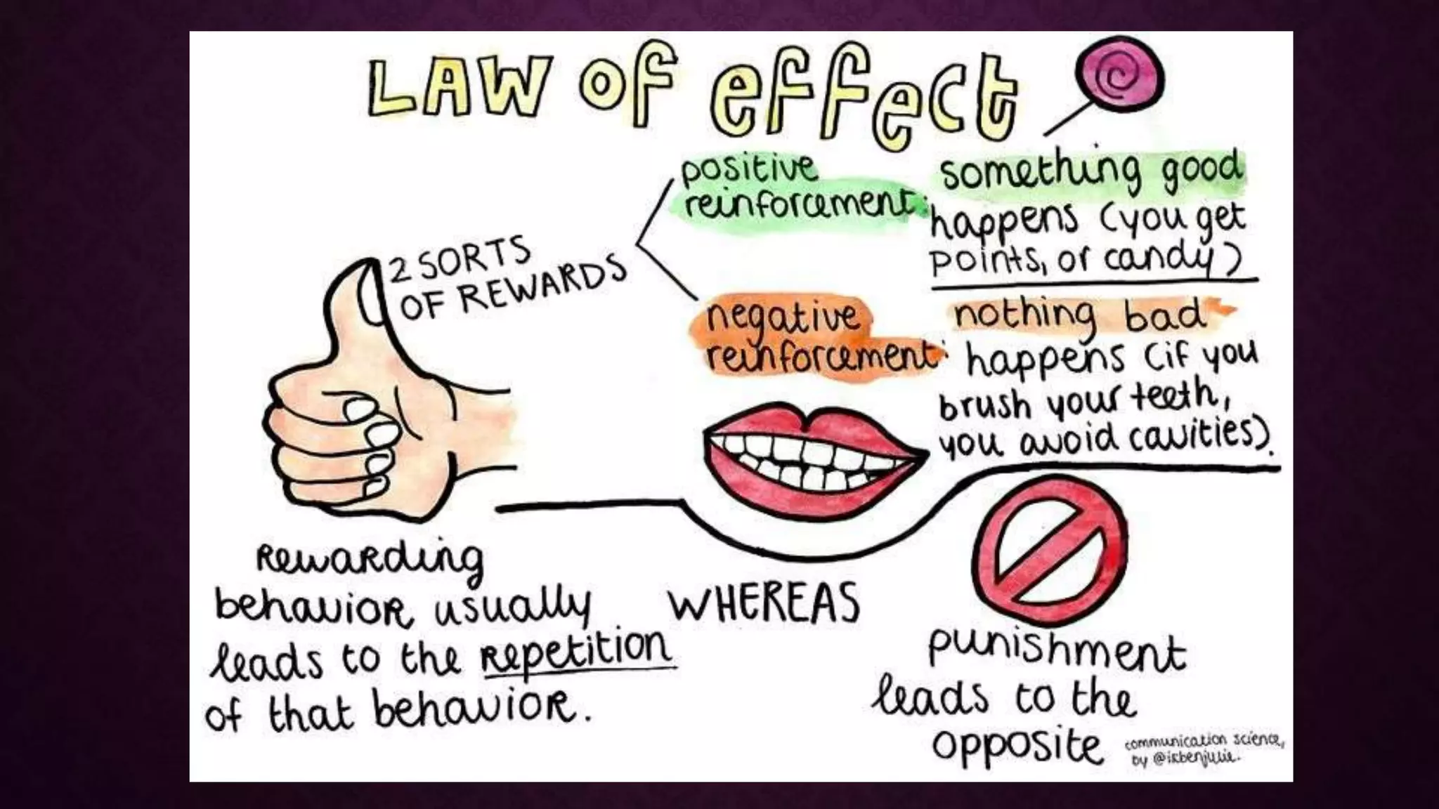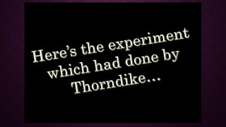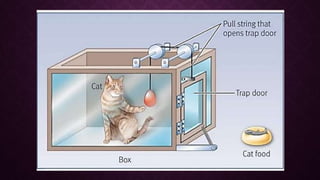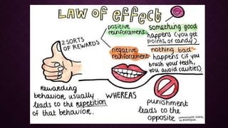 The document discusses Edward L. Thorndike's connectionism theory, highlighting his principles of learning through the formation of associations between stimuli and responses. Key concepts include the laws of exercise and effect, emphasizing that practice strengthens responses while non-practice weakens them, and the importance of readiness in learning. Thorndike later revised his theories, asserting that while rewards enhance learning, punishment does not effectively alter behavior.
