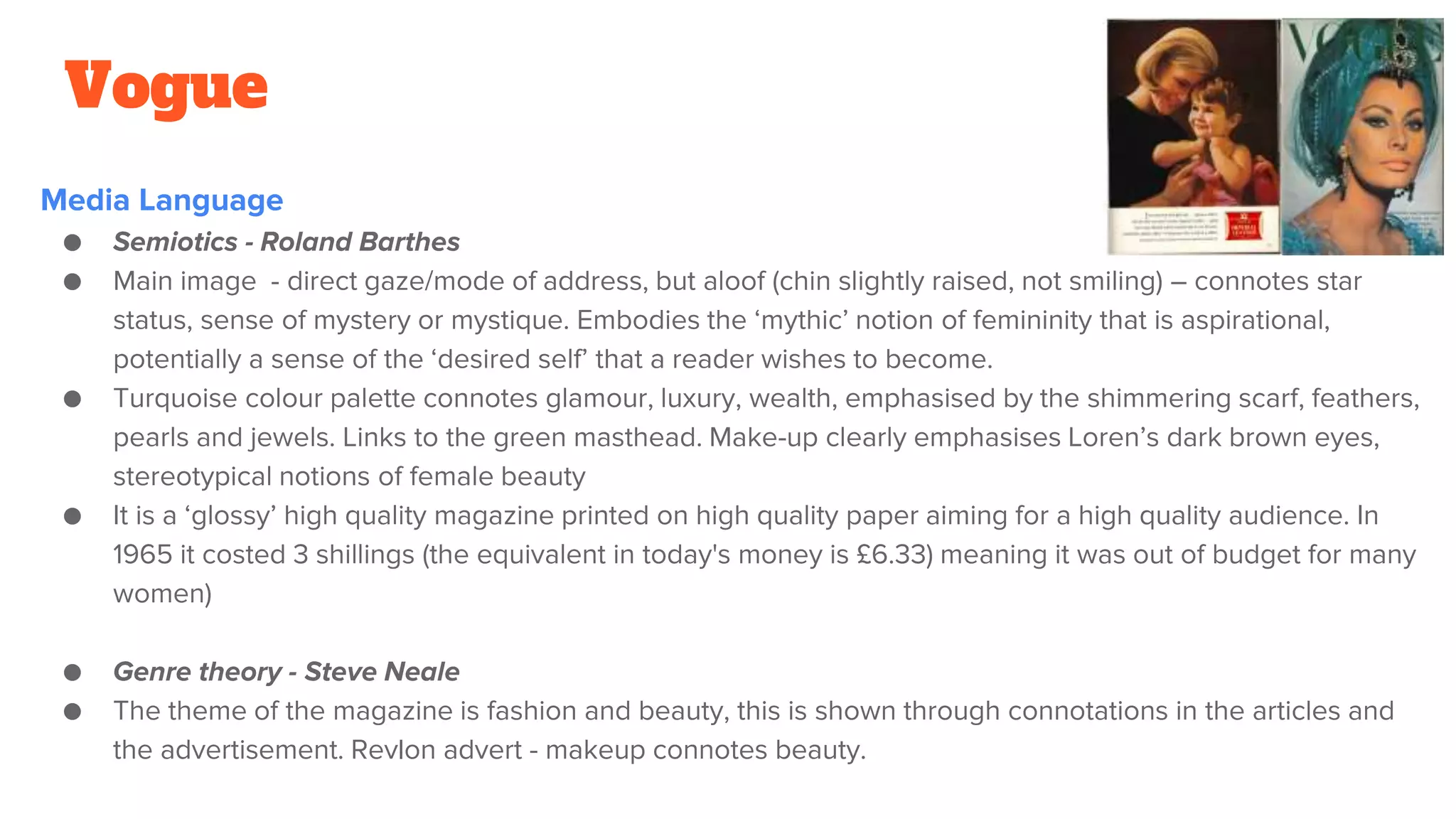 Vogue magazine from 1965 aimed to portray an aspirational lifestyle focused on fashion, beauty, and wealth. It featured glamorous advertisements and models that promoted stereotypical notions of femininity. While some readers may have been entertained or used the magazine to develop their identity, others likely saw the narrow representations as unrealistic or oppressive. As a large publisher, Conde Nast had significant power in the industry to influence audiences and minimize competition.