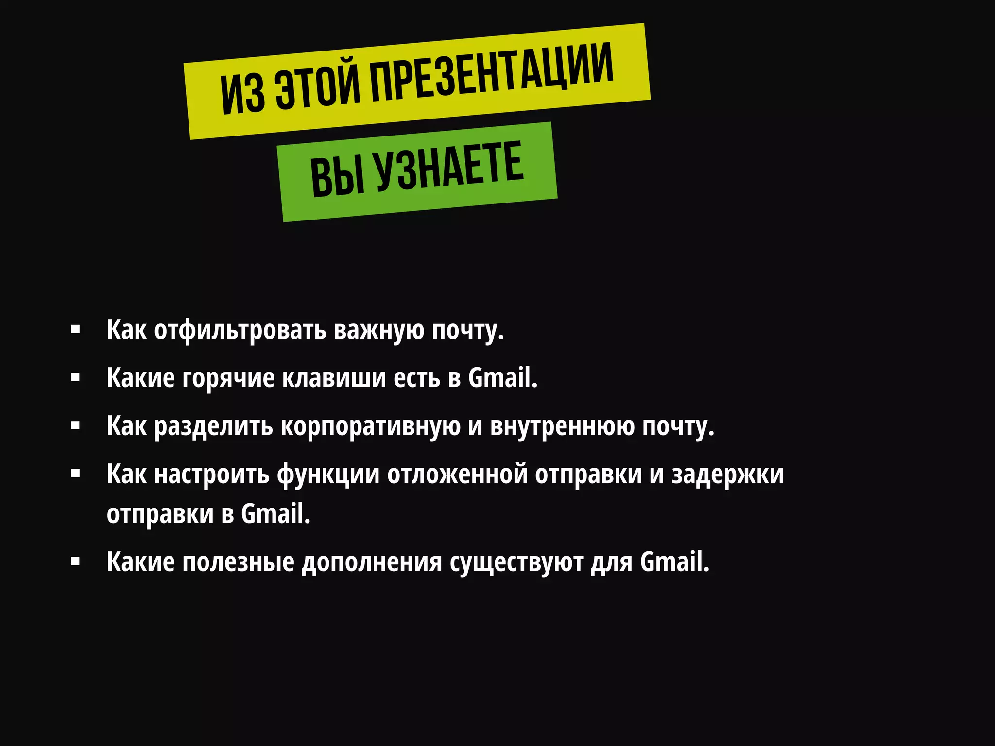 Документ предоставляет рекомендации по эффективному управлению электронной почтой в Gmail, включая использование фильтров для сортировки писем, горячие клавиши для быстрой навигации и функции отложенной отправки. Также обсуждаются способы повышения продуктивности, такие как установка автоответчиков и использование ярлыков для организации писем. Включены советы по настройке рабочего процесса и рекомендациям по проверке почты в оптимальные моменты для минимизации отвлечений.