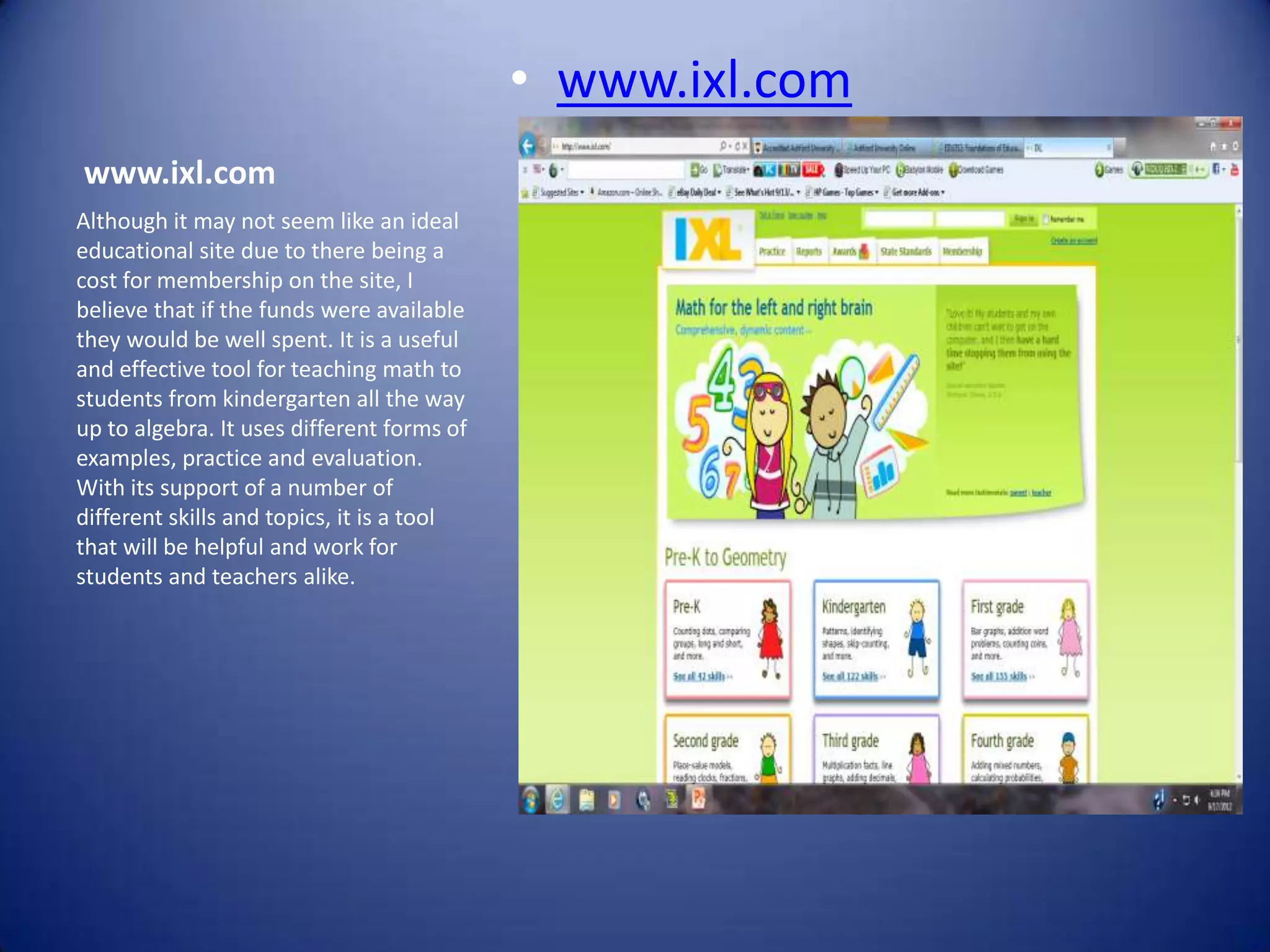 This document provides summaries of and links to various educational websites that could be useful tools for different subjects. Some of the sites summarized include ixl.com for math practice, mathcats.com for interactive math games, aaamath.com for math games and practice, aaaspell.com for spelling and vocabulary, and spellingcity.com for spelling practice activities. Other sites cover subjects like reading, science, history, music, health/PE, art, languages and more. Many are recommended for providing lessons, activities, games and practice opportunities to supplement classroom learning.