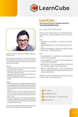 LearnCube is an eLearning solution that makes language learning easy through a blended learning approach combining live online classes and self-paced interactive courses. It allows language schools to expand their reach globally through virtual classrooms and an online course library. Schools benefit from being able to hire teachers anywhere in the world and improve student outcomes while increasing profits by optimizing teacher time and offering course packages. LearnCube is seeking partners and investors in China to help grow its global presence.