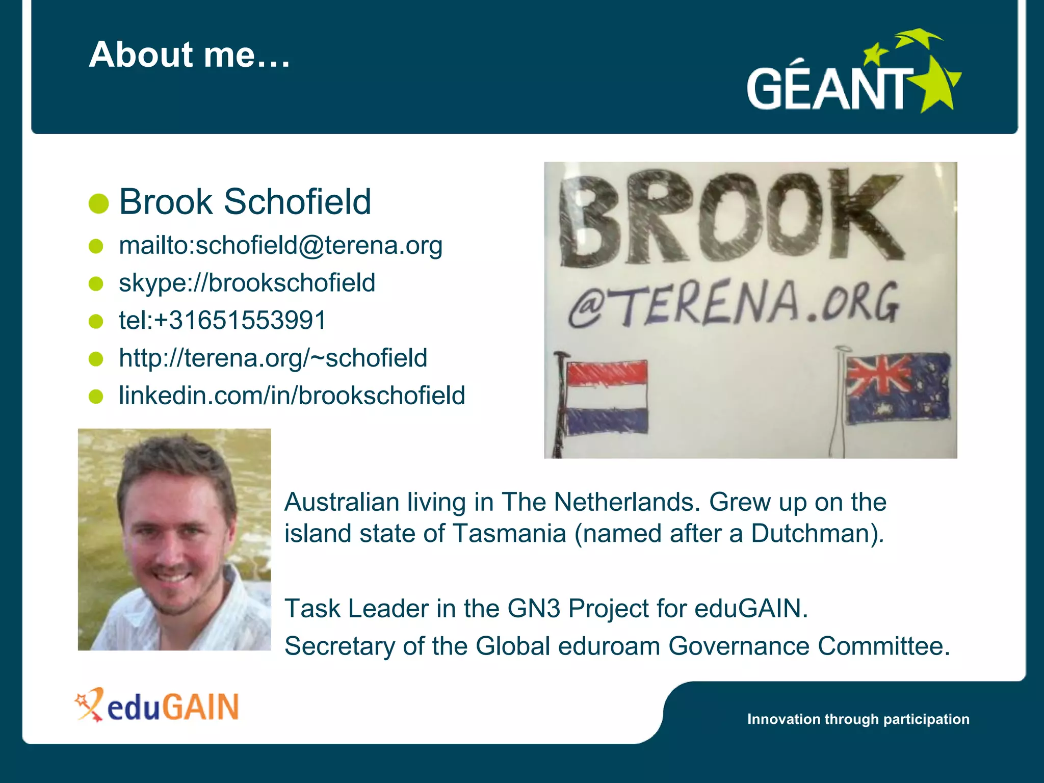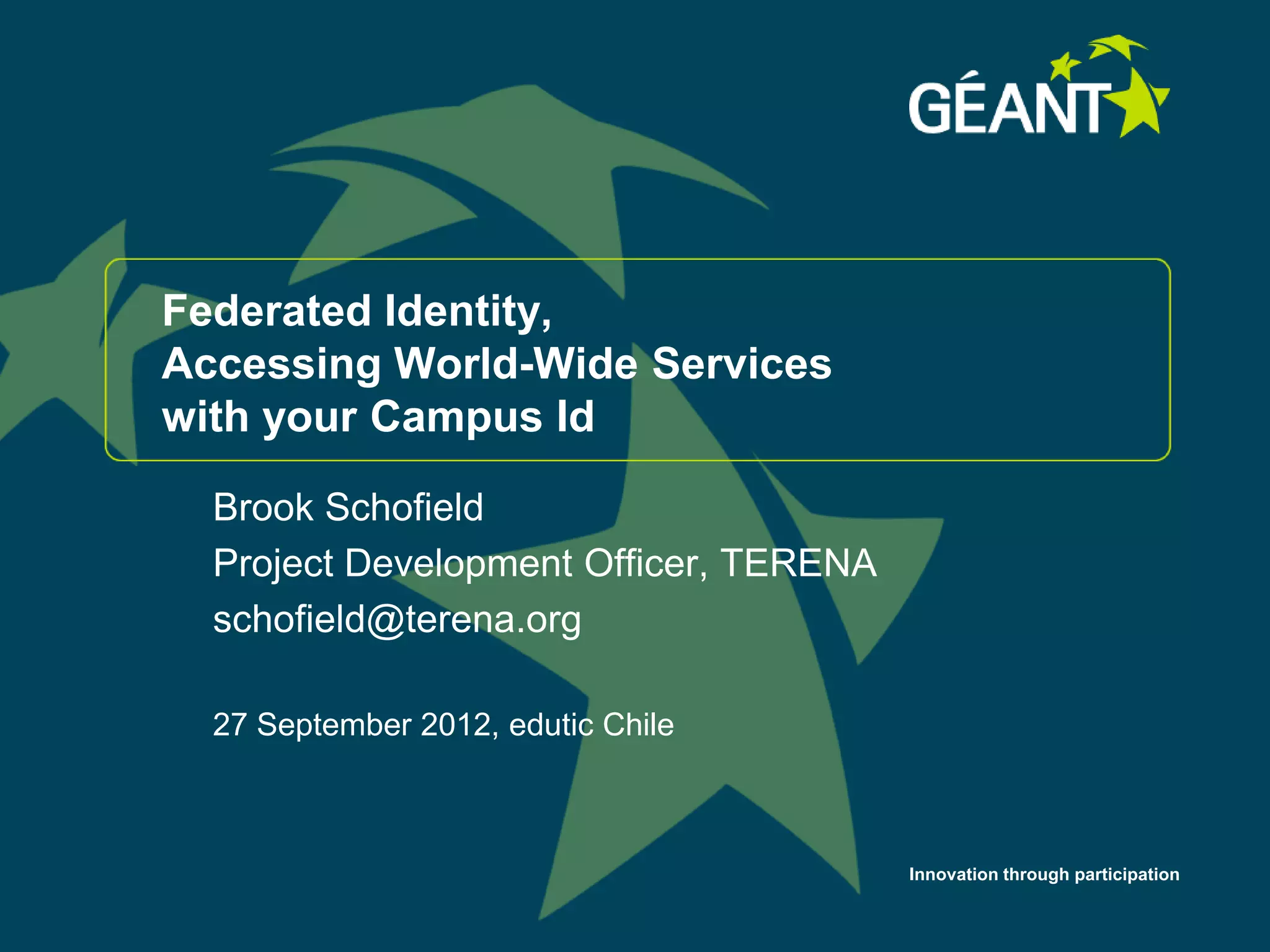 This document discusses federated identity and accessing worldwide services using a campus ID. It introduces federated identity services like eduroam and identity federations that allow users to access resources across organizations securely using their campus credentials. These services build on existing campus identity management systems and provide benefits like a single network for users on and off campus without needing separate guest accounts.