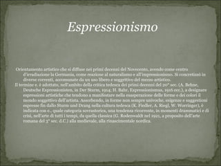 L'espressionismo è un movimento artistico sviluppatosi nei primi decenni del '900 come reazione al naturalismo, caratterizzato da un uso soggettivo dei colori e delle forme per riflettere l'interiorità dell'artista. Edvard Munch è uno dei più significativi precursori dell'espressionismo, trattando temi di angoscia e disagio esistenziale attraverso opere influenti come 'La bambina malata' e 'Il grido', che esprimono profondi sentimenti di malattia e disperazione. A differenza dell'impressionismo, che si focalizza sulla bellezza esteriore, l'espressionismo rifiuta questa idea e si concentra sull'espressione di emozioni e stati d'animo attraverso il 'brutto' e l'angosciante.
