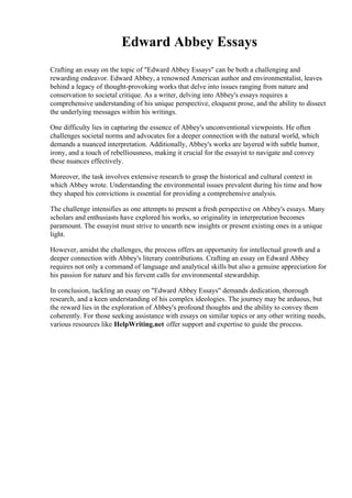 Crafting an essay on Edward Abbey's essays presents several challenges. Abbey was an unconventional American author and environmentalist whose works delved into issues of nature, conservation, and social critique. To understand his unique perspective and subtle messages, one must conduct extensive research on Abbey's historical context and grasp his passion for the environment. Additionally, presenting a fresh interpretation of Abbey's essays is difficult because many scholars have explored his works. However, despite the challenges, analyzing Abbey's essays offers an opportunity for intellectual growth and a deeper appreciation of his advocacy for environmental stewardship.
