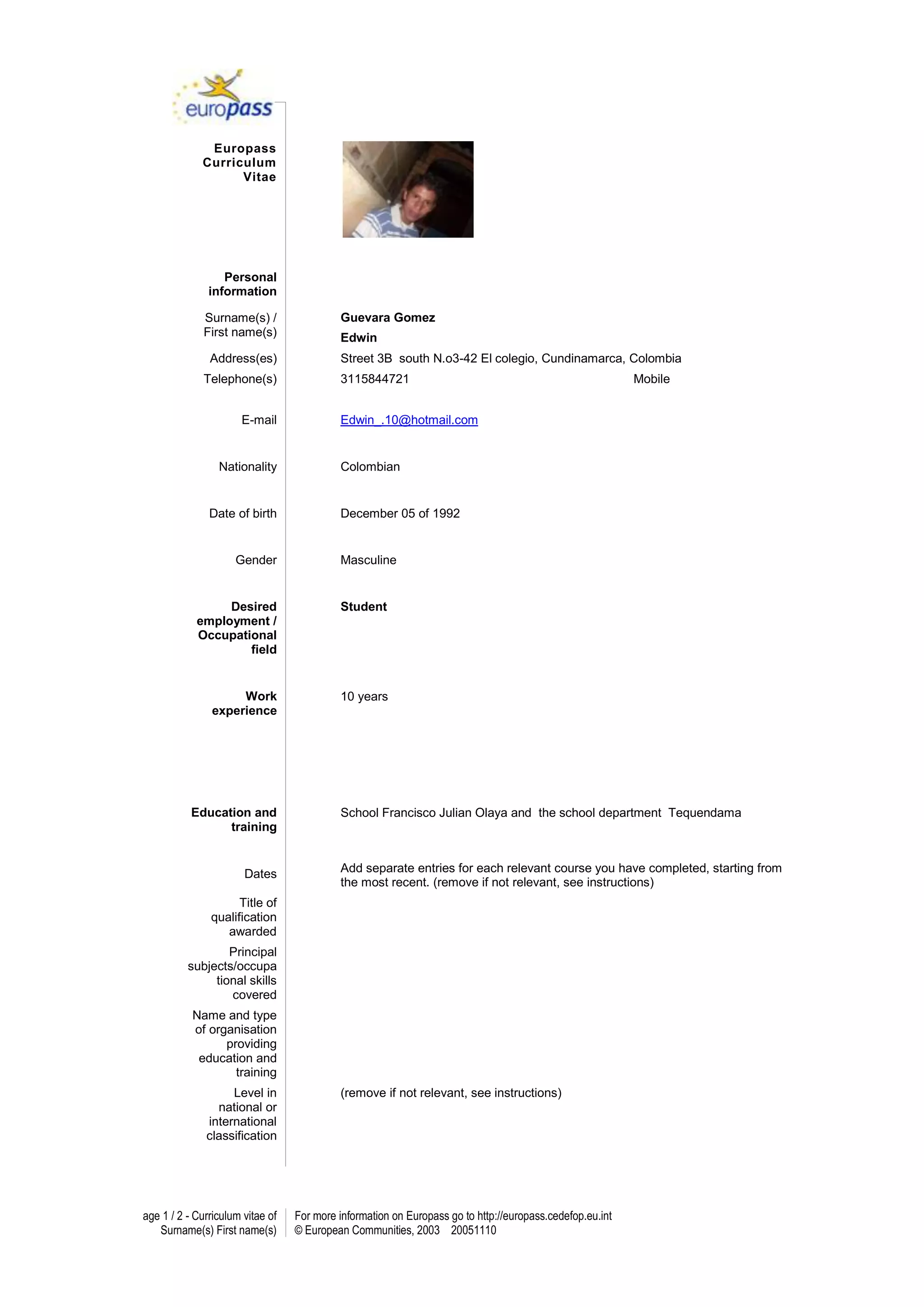 434340-3810 EuropassCurriculum VitaePersonalinformationSurname(s) / First name(s)Guevara GomezEdwinAddress(es)Street 3B south N.o3-42 El colegio, Cundinamarca, ColombiaTelephone(s)3115844721MobileE-mailEdwin_.10@hotmail.comNationalityColombianDate of birthDecember 05 of 1992GenderMasculineDesired employment / Occupational fieldStudentWork experience10 years Education and trainingSchool Francisco Julian Olaya and the school department TequendamaDatesAdd separate entries for each relevant course you have completed, starting from the most recent. (remove if not relevant, see instructions) Title of qualification awardedPrincipal subjects/occupational skills coveredName and type of organisation providing education and trainingLevel in national or international classification(remove if not relevant, see instructions)Personal skills and competencesMother tongue(s)Specify mother tongue (if relevant add other mother tongue(s), see instructions)Other language(s)Self-assessmentUnderstandingSpeakingWritingEuropean level (*)ListeningReadingSpoken interactionSpoken productionLanguageaA1aAA1Language(*) Common European Framework of Reference for LanguagesSocial skills and competencesReplace this text by a description of these competences and indicate where they were acquired. (Remove if not relevant, see instructions)Organisational skills and competencesReplace this text by a description of these competences and indicate where they were acquired. (Remove if not relevant, see instructions)Technical skills and competencesReplace this text by a description of these competences and indicate where they were acquired. (Remove if not relevant, see instructions)Computer skills and competencesReplace this text by a description of these competences and indicate where they were acquired. (Remove if not relevant, see instructions)Artistic skills and competencesReplace this text by a description of these competences and indicate where they were acquired. (Remove if not relevant, see instructions)Other skills and competencesReplace this text by a description of these competences and indicate where they were acquired. (Remove if not relevant, see instructions)Driving licenceState here whether you hold a driving licence and if so for which categories of vehicle. (Remove if not relevant, see instructions)Additional informationInclude here any other information that may be relevant, for example contact persons, references, etc. (Remove heading if not relevant, see instructions)AnnexesList any items attached. (Remove heading if not relevant, see instructions)<br />