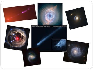 Edwin Hubble was an American astronomer born in 1889 who made several groundbreaking discoveries about the universe, including Hubble's Law which showed a relationship between galaxies' speeds and distances, demonstrating the universe's expansion. He also proved the existence of galaxies outside the Milky Way. Hubble received many honors for his work, including medals from scientific organizations, and several places and objects in space are named after him, including the Hubble Space Telescope launched in 1990 which takes high quality photographs from its orbit around Earth.