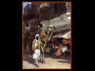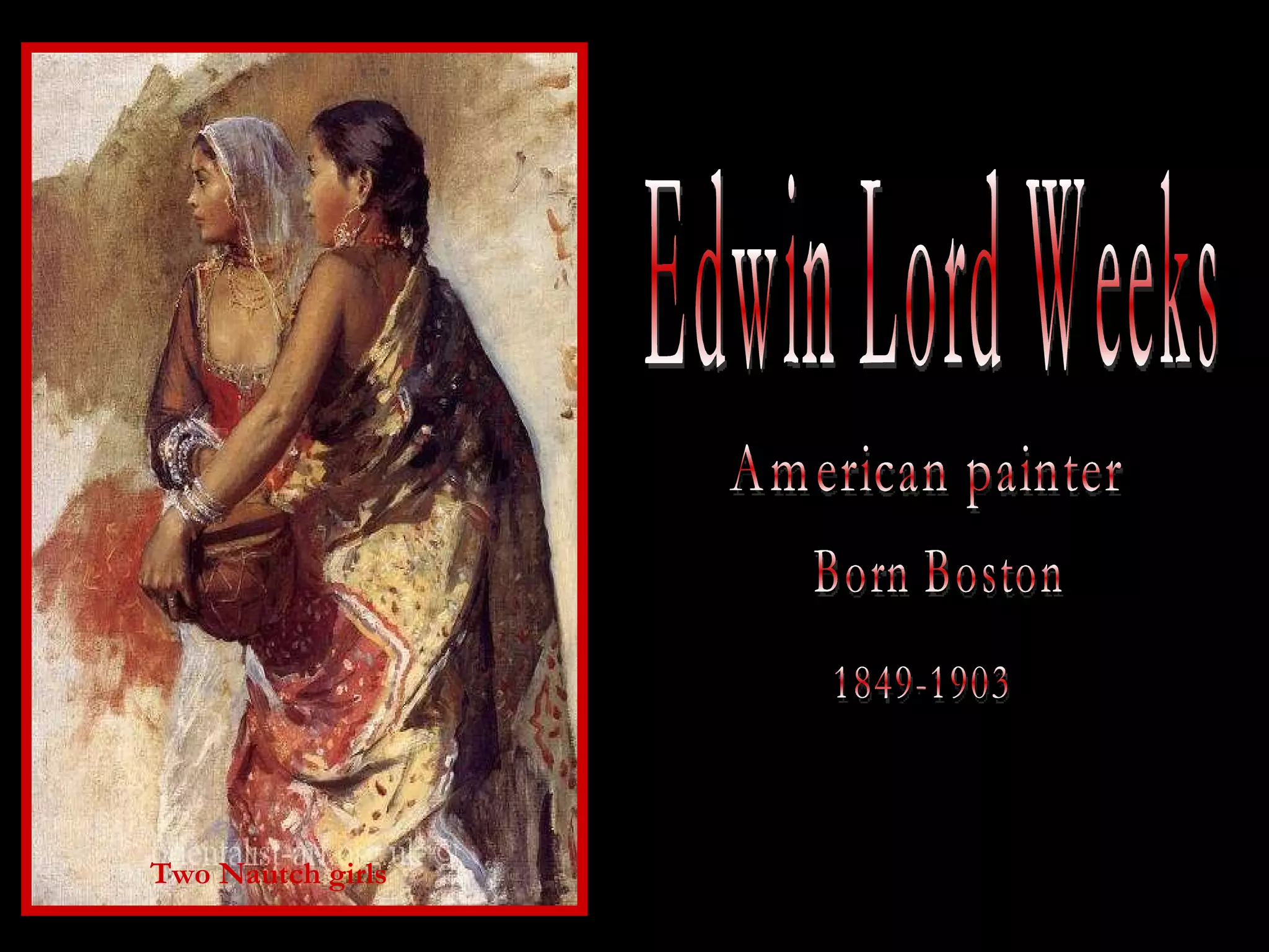 This document provides descriptions of 22 paintings by American painter Edwin Lord Weeks from 1849-1903. The paintings depict various scenes from India and other locations including Delhi, Lahore, Agra, Bombay, Cordova, and Rabat showing religious sites, royal figures, daily life, and landscapes. They cover subjects such as mosques, temples, royal processions, merchants, snake charmers, and bathing places.