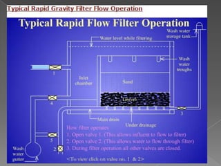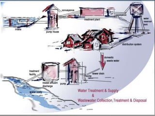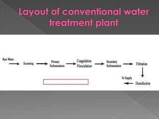 The document outlines the treatment and purification processes required for raw water before it can be safely used for domestic or industrial purposes. Key steps include aeration, sedimentation, coagulation, flocculation, filtration, and disinfection, depending on the characteristics of the water and intended use. The document provides specific parameters for desirable water quality and treatment methods, as well as equipment design details for effective water treatment.
