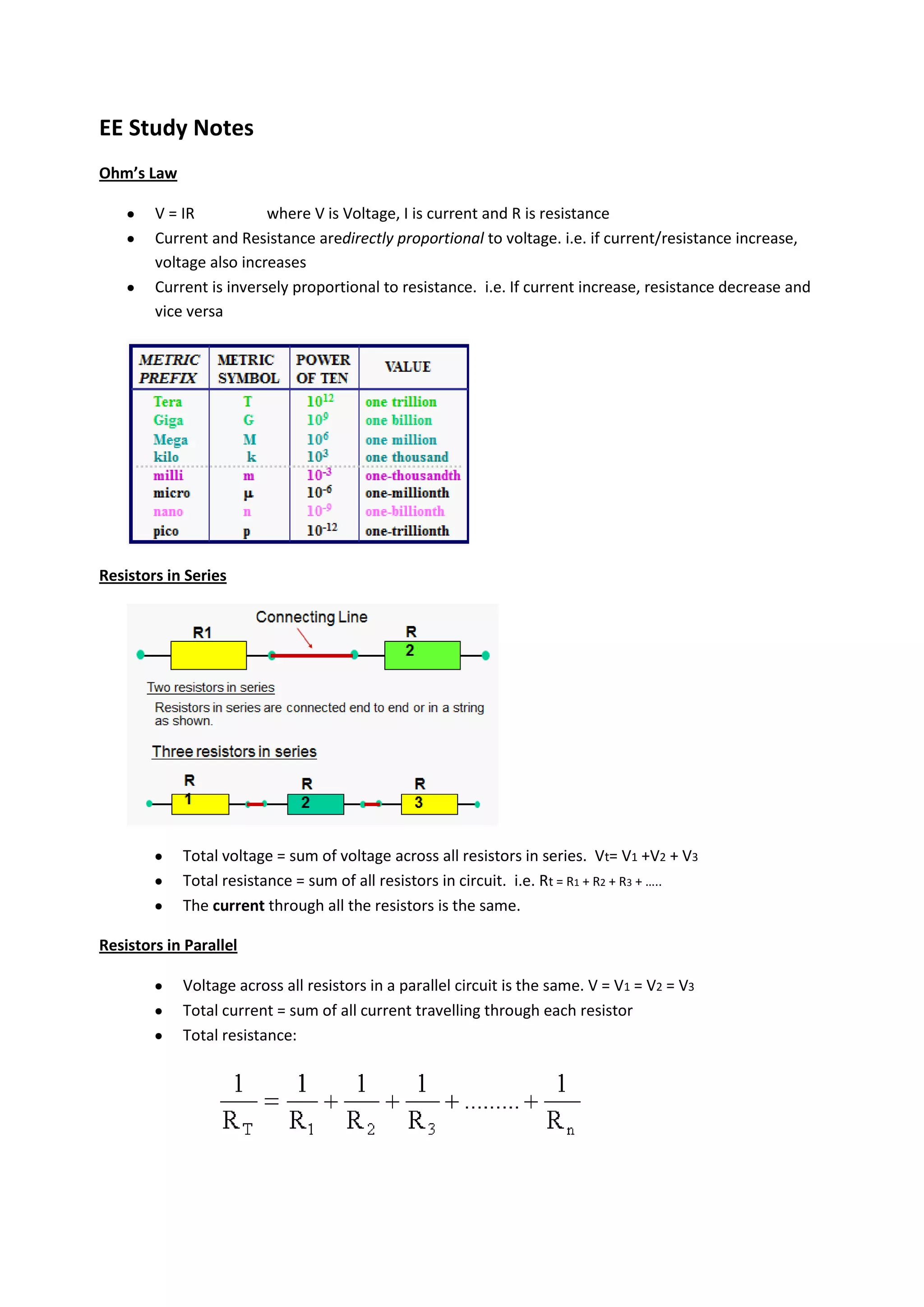 1. Ohm's Law defines the relationship between voltage, current, and resistance in a circuit. Resistors in series have a total voltage equal to the sum of individual voltages and a single current. Resistors in parallel have the same voltage but total current equals the sum of individual currents.