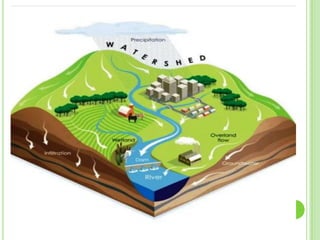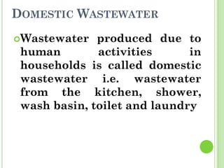 Wastewater is water that has been used and contains 0.1% impurities including organic matter, microorganisms, and inorganic compounds. There are two main types of wastewater: domestic wastewater which comes from households and contains constituents like dissolved solids, suspended solids, nitrogen, and phosphorus, and industrial wastewater which results from water used in industrial processes. Watershed management aims to develop land and water resources in a balanced ecological way through practices like rainwater harvesting, which is the collection, storage, and purification of rainwater running off surfaces for later use through systems that catch, convey, filter, and store the water.