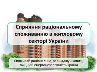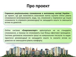Promoting rational consumption in the residential sector in Ukraine - is a project that enables homeowners to evaluate online their consumption of electricity, water, gas, heating compared to the other customers and get recommendations how to save money and reduce environmental impact.
