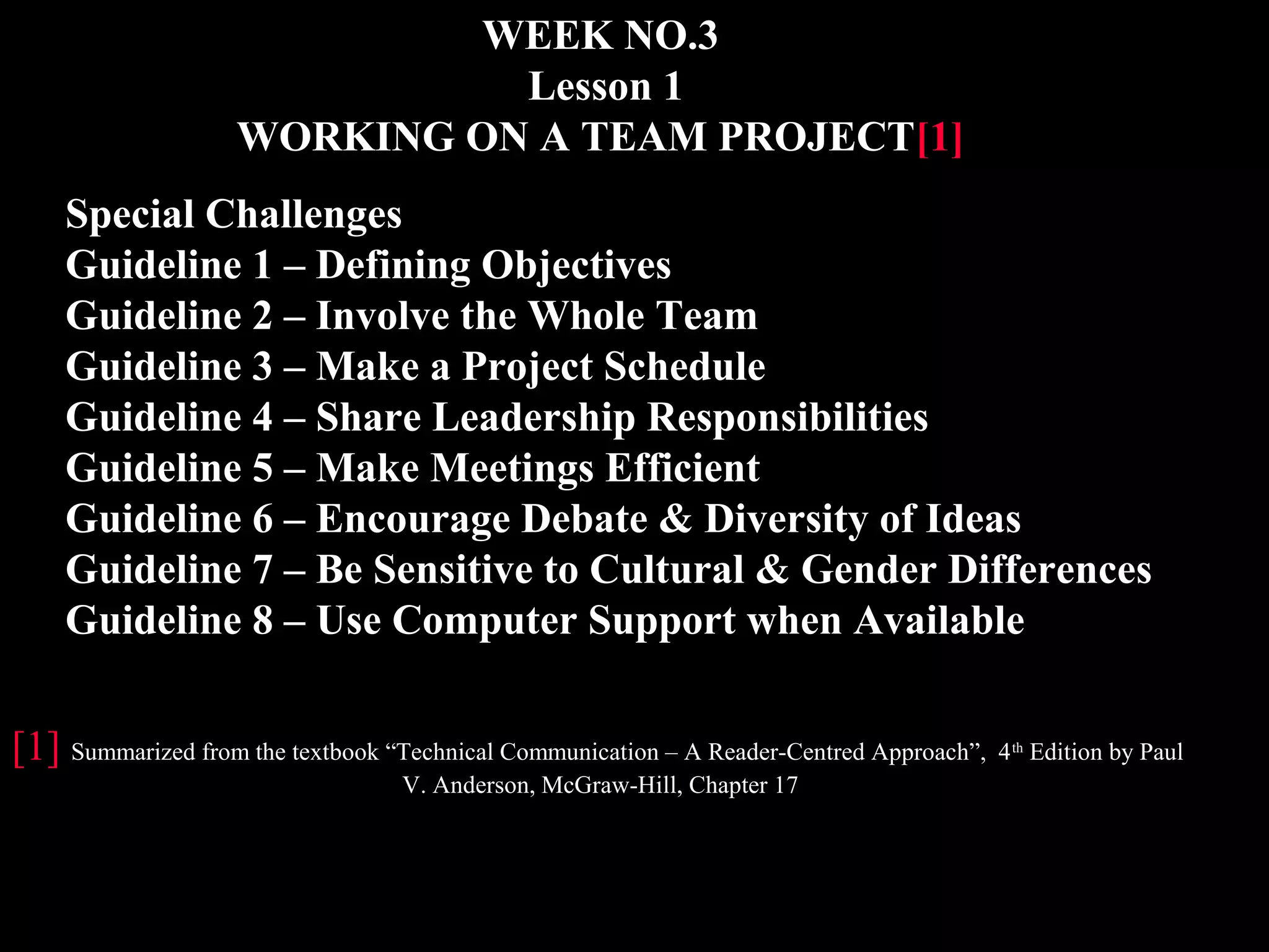 The document provides guidelines for effective team projects, including defining objectives, involving the whole team, making a project schedule, sharing leadership responsibilities, encouraging debate and diversity, being sensitive to cultural and gender differences, and using computer support. It discusses defining objectives and planning as a team to generate better results. It also describes task roles like initiators and opinion givers, and group maintenance roles to assure good working relationships.