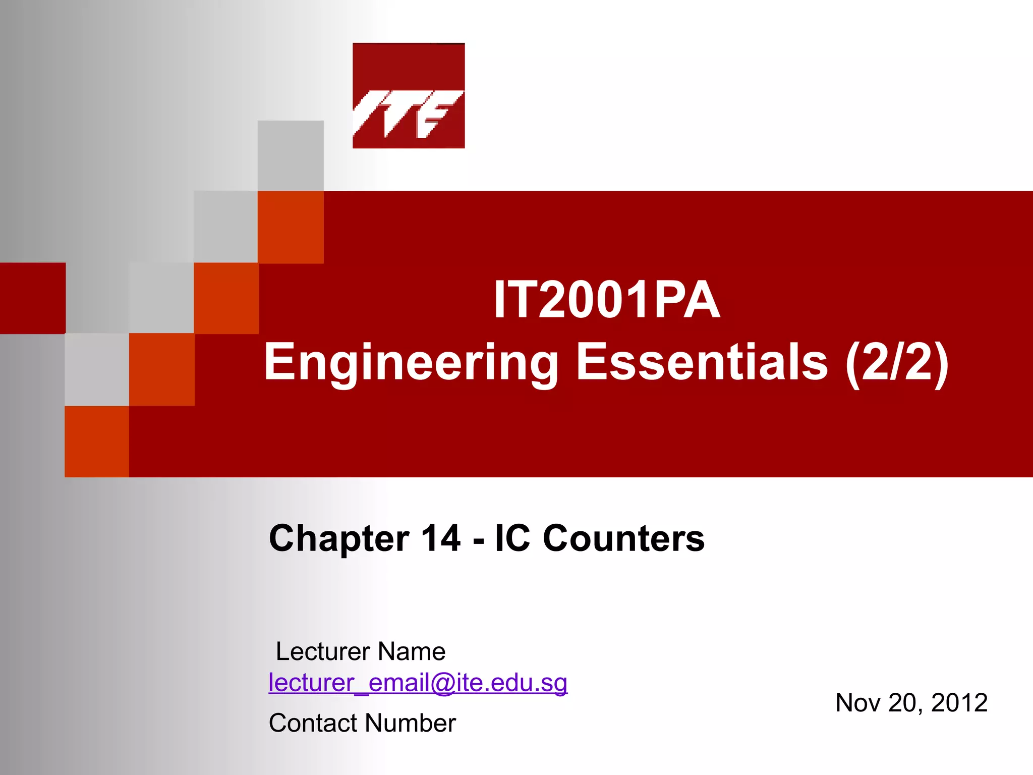 This document discusses using integrated circuit counters. It describes objectives of learning how to design simple synchronous and asynchronous counters using MSI chips. Specific objectives include being able to state common counter chips, describe their control pins, and design counters based on their technical references. Examples are provided on wiring a 74293 chip to make MOD-16, MOD-10 and MOD-14 counters, as well as combining two 74293s to make a MOD-60 counter.
