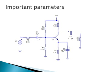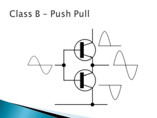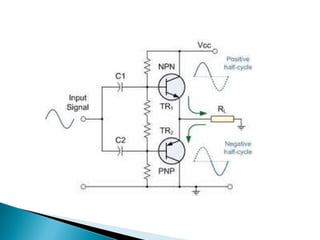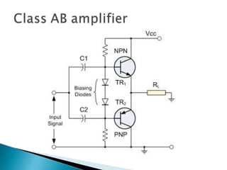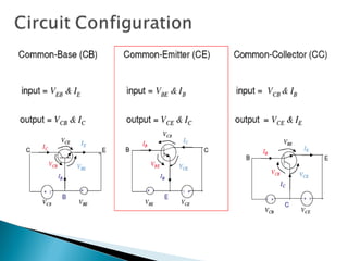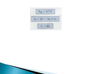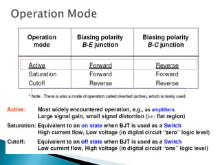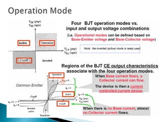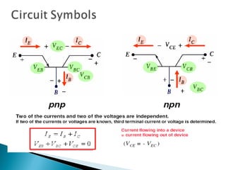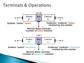 This document discusses bipolar junction transistors (BJTs). It describes the basic structure and operation of NPN and PNP BJTs, including their three terminals (base, emitter, collector), current flow, and biasing. BJTs can be used as switches in digital circuits or amplifiers in analog circuits. The document also covers BJT characteristics such as active, saturation, and cutoff regions; DC current gains; and voltage relationships. BJT amplifier classes like Class A, B, AB, and C are introduced along with their relative efficiencies. Stabilization techniques for BJT amplifiers using emitter feedback and voltage divider biasing are also summarized.