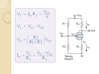 The document discusses field effect transistors (FETs), specifically junction field effect transistors (JFETs) and metal-oxide-semiconductor field effect transistors (MOSFETs). It describes the basic construction, operation, and characteristics of n-channel and p-channel JFETs and MOSFETs. Application circuits for JFET and MOSFET amplifiers and switches are also presented. Key differences between BJTs, JFETs, and MOSFETs are highlighted.