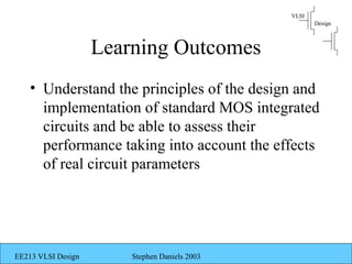 This document provides an overview of a VLSI design module. It introduces VLSI technology, including chip fabrication processes, circuit design principles, and practical experience in layout design. The module aims to help students understand MOS integrated circuit design and performance when accounting for real circuit parameters. It will provide hands-on experience using a layout and simulation software package. Reading materials are also listed to support learning about microelectronics, VLSI design, and basic VLSI concepts.
