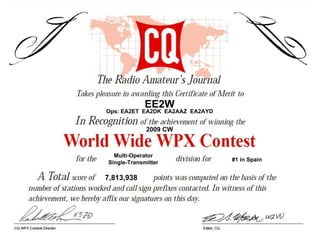This document appears to be a summary of a multi-operator amateur radio contest in Spain in 2009, where the callsign listed as "Multi-Operator #1 in Spain" earned over 7.8 million points using a single transmitter to contact other amateur radio operators.