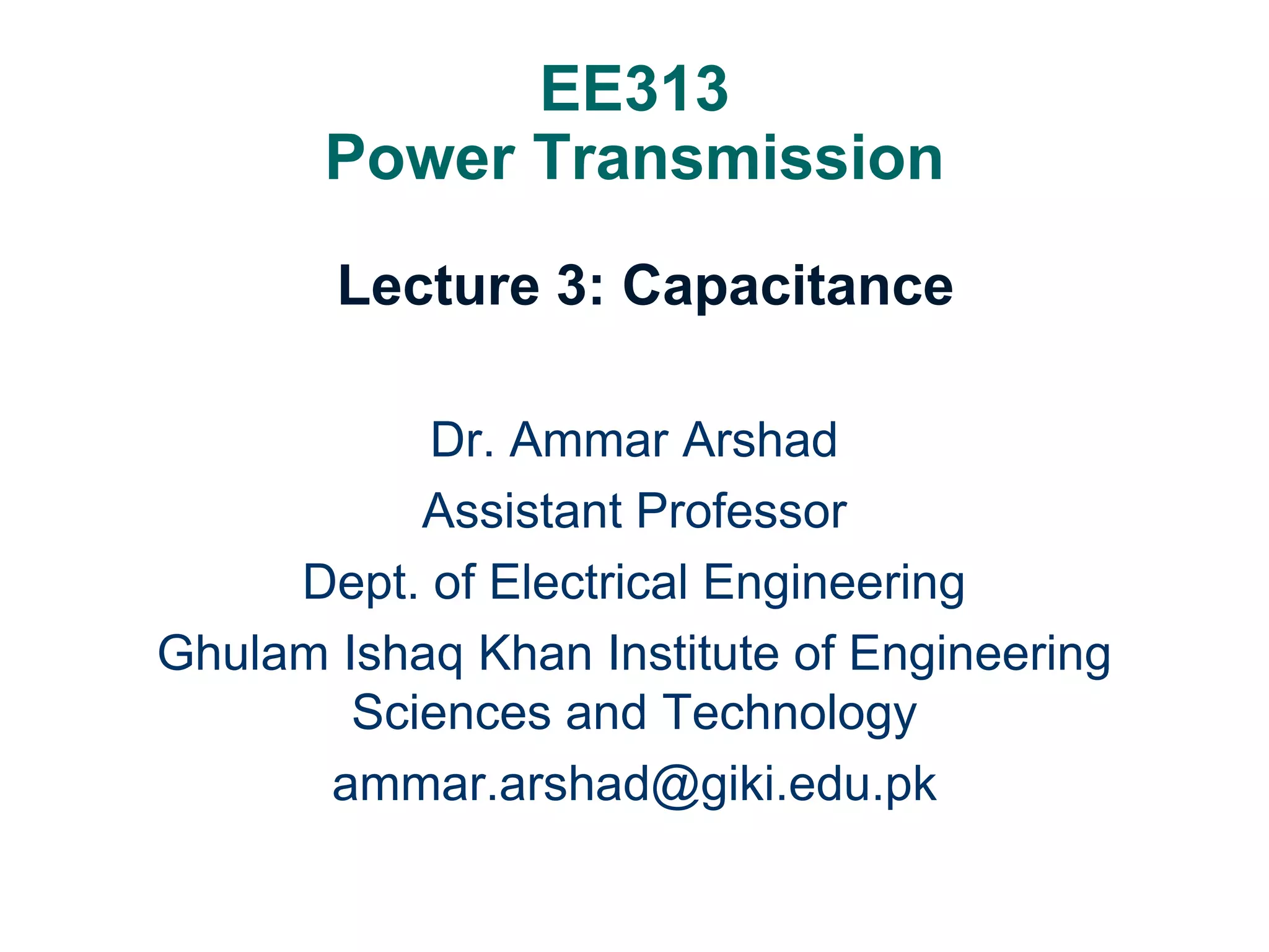This document discusses capacitance in power transmission lines. It begins by defining potential difference between two points due to a charge and the concept of capacitance as the work done to move a unit charge through an electric field. It then examines the capacitance of two-wire and three-phase power lines with both equilateral and unsymmetrical spacing between conductors. Specifically, it provides equations for calculating capacitance between conductors in different configurations and discusses the effects of bundling multiple conductors.