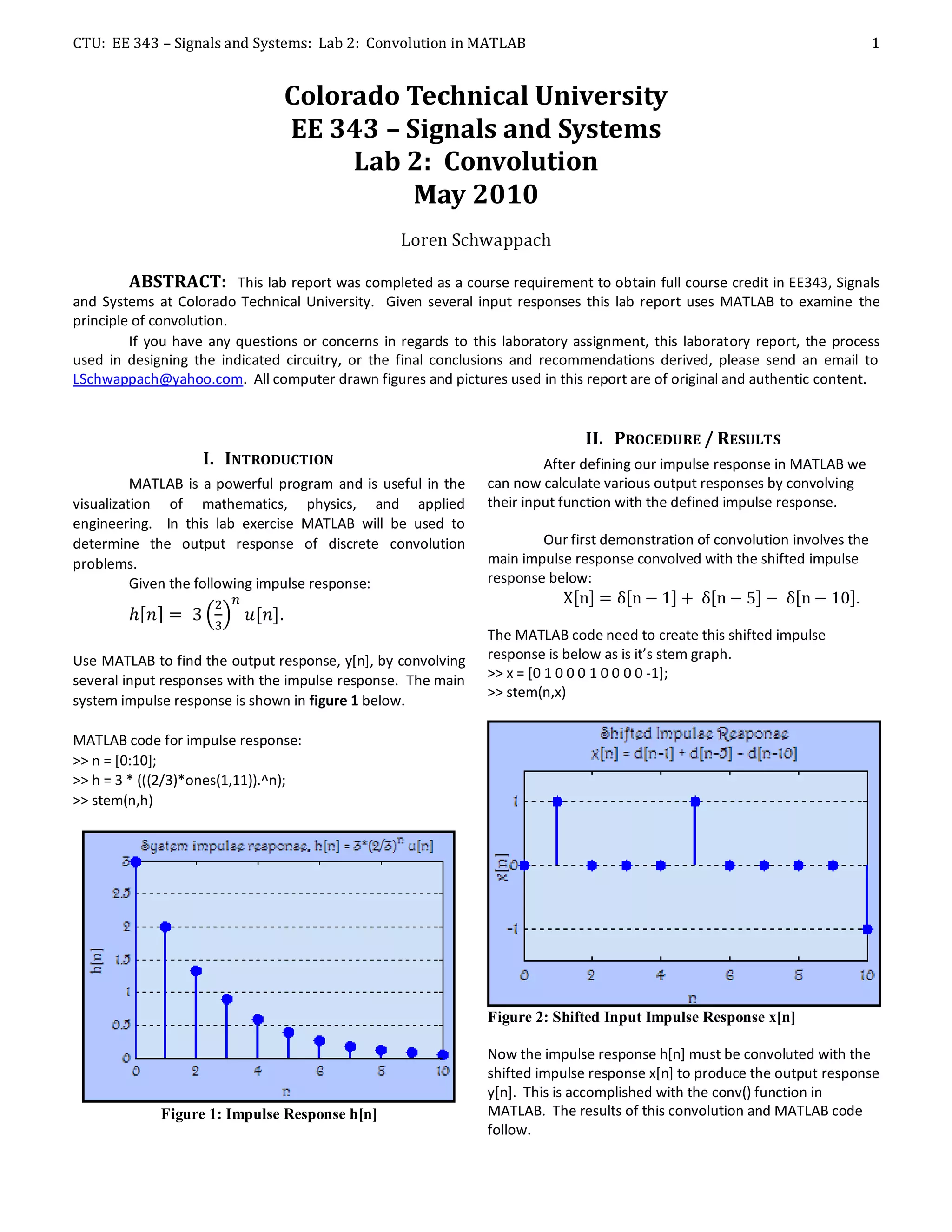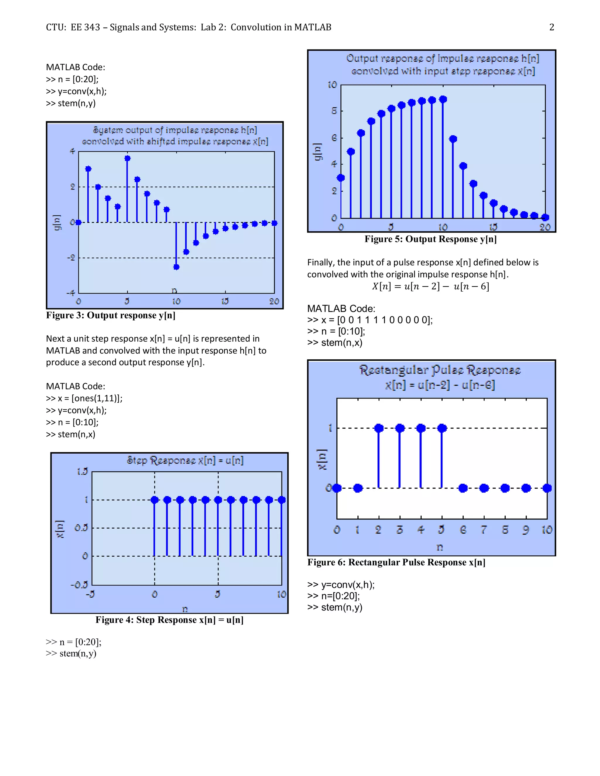 This lab report examines convolution using MATLAB. It defines an impulse response h[n] and uses it to convolve various input signals x[n], including a shifted impulse response, a unit step response, and a rectangular pulse, producing the corresponding output responses y[n]. The MATLAB code generates the input and output signals and plots the results. The output responses are verified by hand calculations of the convolution, showing MATLAB produces correct results. The lab demonstrates how MATLAB can efficiently perform and visualize discrete-time convolution.