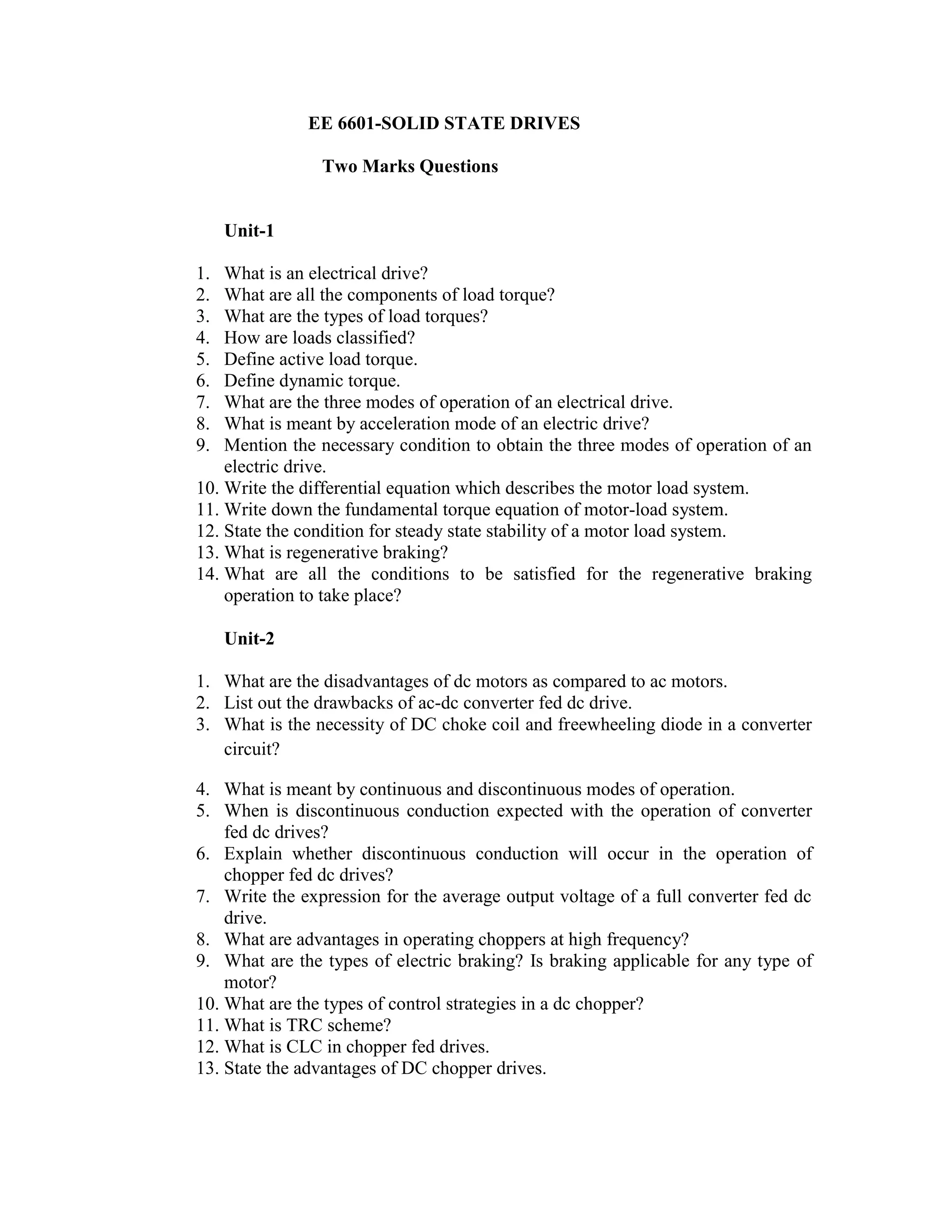 This document contains questions from 5 units related to solid state drives. It includes questions about electrical drives and their components, DC and AC motor drives, speed control methods, and specific motor types like induction motors, synchronous motors, and permanent magnet synchronous motors. The questions cover topics like drive system modeling, operating modes, control strategies, and performance analysis.