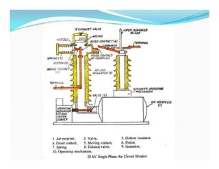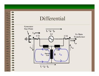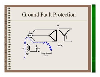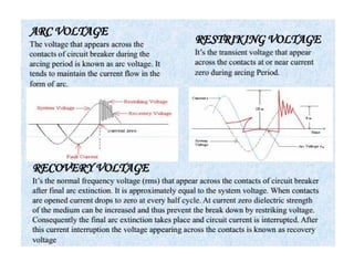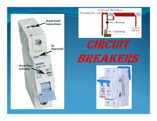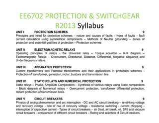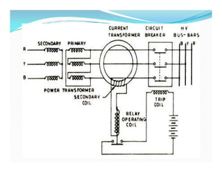 This document provides an overview of protection and switchgear for an electrical engineering course. It includes definitions of key components in a power system like transformers, circuit breakers, and protective relays. It also describes the purpose of a protection system to isolate faults and prevent equipment damage. Additional sections cover current and voltage transformers, batteries, fuses, lighting arresters, and the different categories and functions of switchgear.