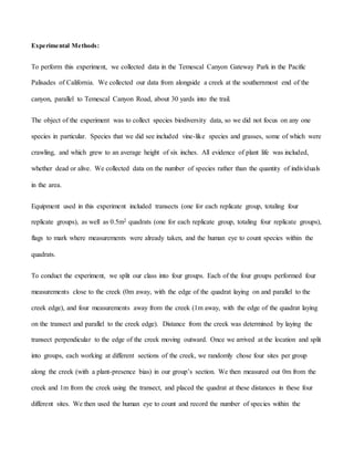 The study examined the effect of distance from a water source (Temescal Canyon creek) on plant biodiversity. Data on the number of plant species was collected within quadrats placed 0m and 1m from the creek across 16 replicate sites. Statistical analysis found significantly higher average species richness and a greater range of species closer to the creek, supporting the hypothesis that less distance from water leads to greater biodiversity. The results demonstrate the importance of water sources for developing plant diversity in ecosystems.