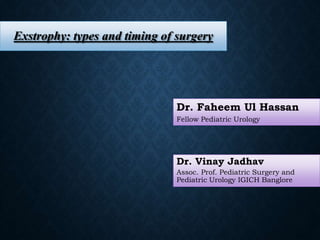 The document discusses various surgical techniques for repairing exstrophy of the bladder, including: